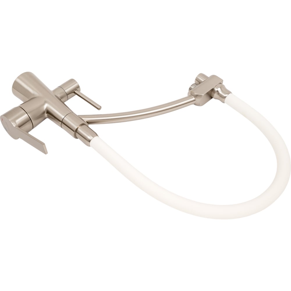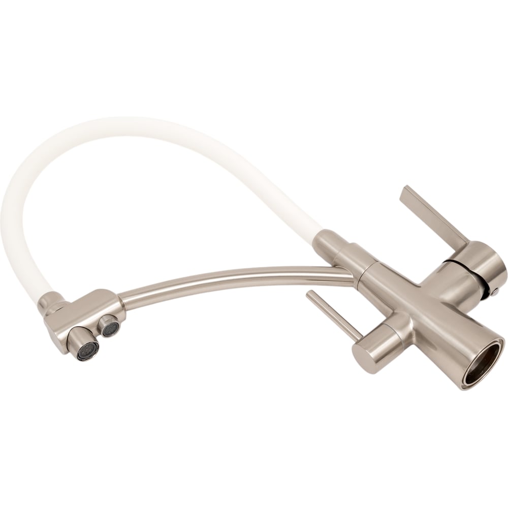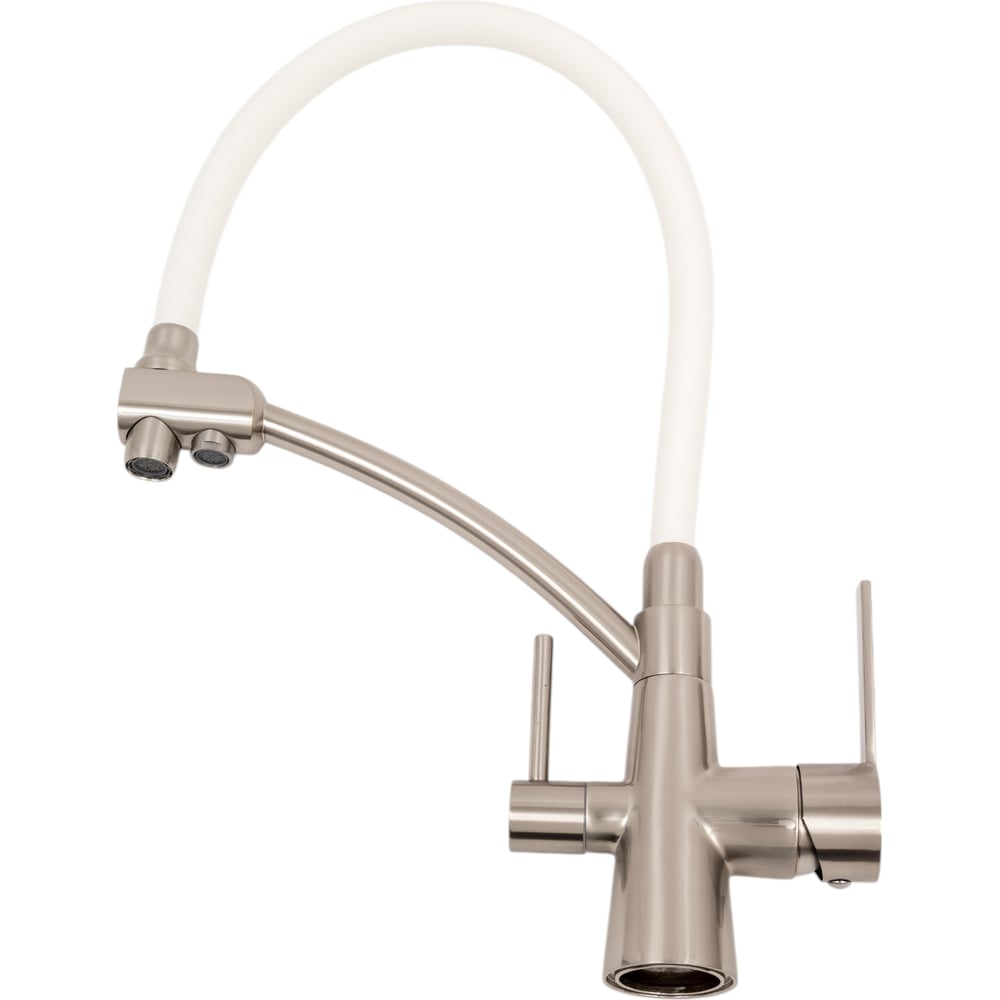 Цвет белый/сатин Тип установки настольный Стиль современный Материал корпуса латунь Поворотный излив да Назначение для кухни Тип крепления на шпильку Гибкий излив да Длина излива 221 мм Высота смесителя 440 мм Лейка нет Термостат нет Встраиваемый нет Подводка в комплекте гибкая Аэратор да Переключатель на фильтр да Тип смесителя однорычажный Форма излива воды традиционная Запорный клапан керамический картридж Форма смесителя округлая Выдвижной излив нет Излив есть Складной нет С щеткой нет Двойной излив есть Диаметр картриджа 40 мм Направление струи под углом Диаметр отверстия в раковине 35 мм Расположение термостата без термостата