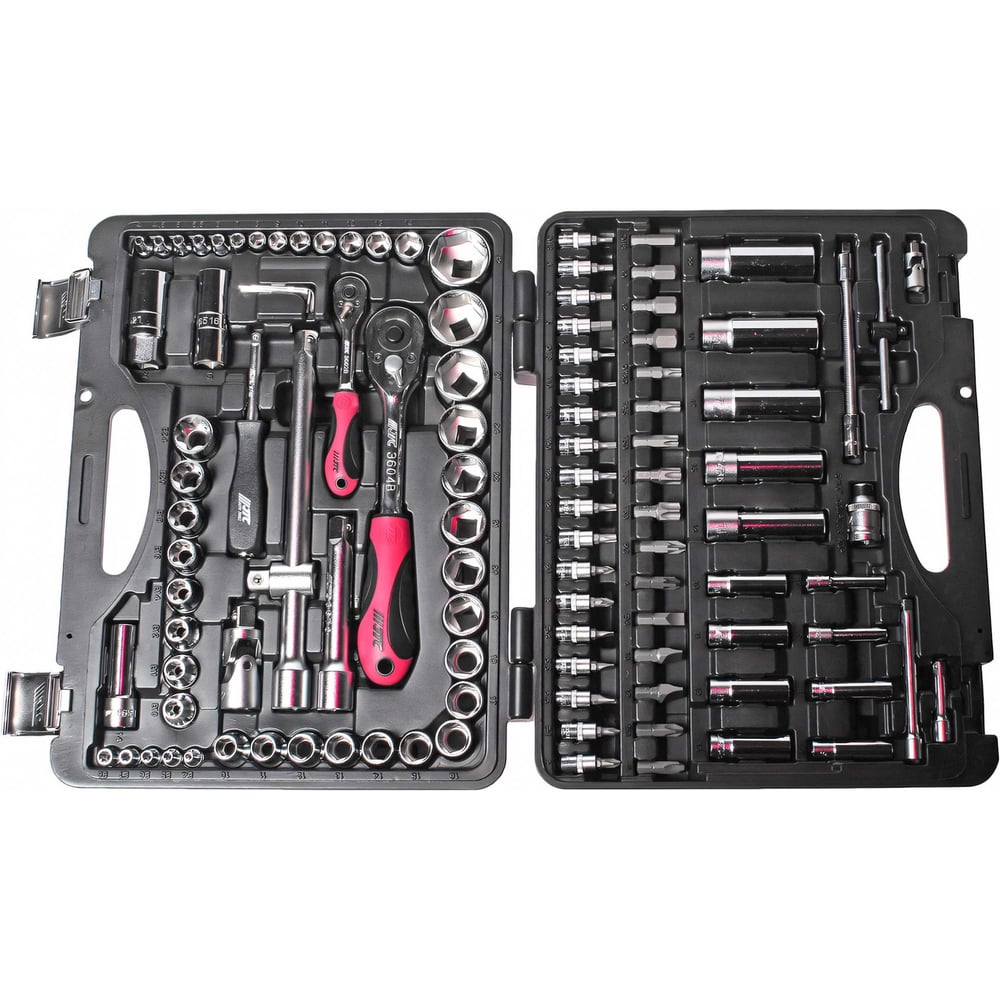 Комплектация 1/2": Головка торцевая: 10-22, 24, 27, 30, 32 мм. Головка торцевая длинная: 14, 15, 17, 19, 22 мм. Головка торцевая: Е10, Е11, Е12, Е14, Е16, Е18, Е20, Е24. Насадка 5/16" HEX: 7, 8, 10, 12, 14 мм. Насадка 5/16" TORX: T40, T45, T50, T55, T60. Насадка 5/16'‘ PH для ударной отвертки: PH3, PH4. Насадка 5/16» PZ для ударной отвертки: PZ3, PZ4. Насадка 5/16'‘ 30мм шлиц: 8, 10, 12 мм. Трещотка силовая 72 зубца, резиновая ручка. Удлинитель: 125 мм. Удлинитель: 250 мм. Кардан. Головка свечная: 14, 16, 21 мм. Переходник 3/8"х1/2" с отверстием. Держатель бит: 3/8"х5/16".