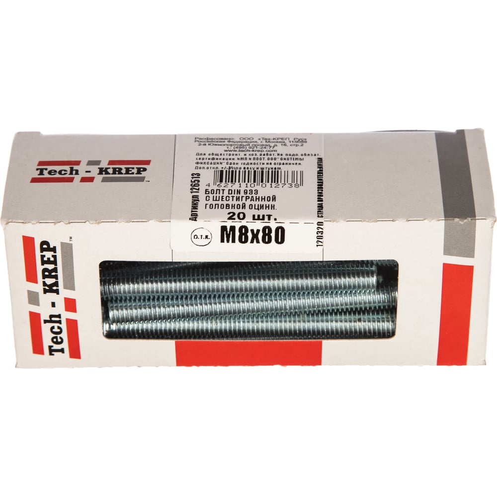 Болт DIN 933 с шестигранной головкой, оцинкованный М8х80, 20шт - коробка Tech-Krep 126513