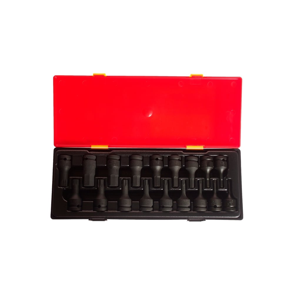 Габариты без упаковки 360х130х50 мм Материал CrMo Количество 18 шт Вес нетто 2.33 кг Ударная да Тип крепления квадрат с отверстием Размер посадки 1/2 дюйма Система измерения метрическая Глубокая нет Наконечник Torx, Hex Max размер головки 19 мм Min размер головки 5 мм Упаковка кейс Количество граней 4 Размер головки TORX min T25 Размер головки TORX max T60 Min размер головки нет дюйм Max размер головки нет дюйм Размер головки SPLINE min M14 мм Размер головки SPLINE max M16 мм Размер головки E max нет Размер головки E min нет