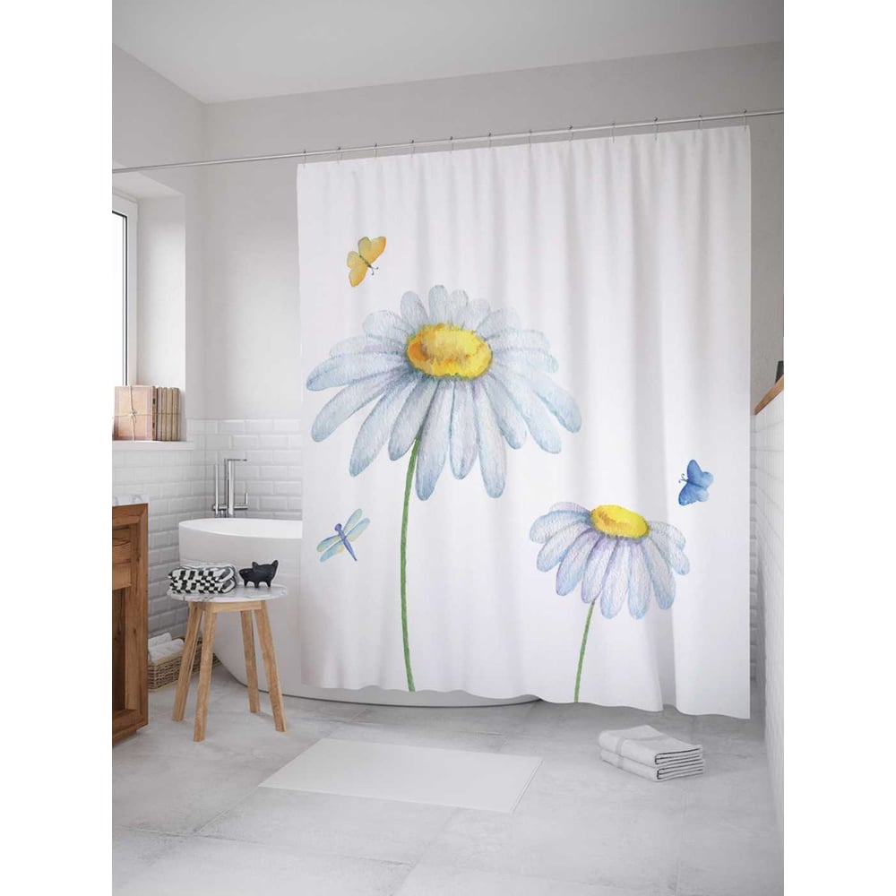 Штора (занавеска) для ванной JoyArty "Ромашки и стрекоза" из сатена, 180х200 см с крючками, sc_18368