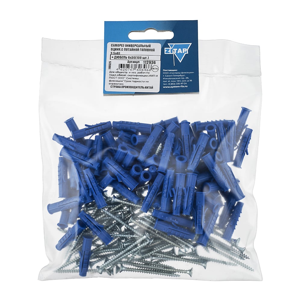 Саморез ШУц с потайной головкой 3,5x40 мм + дюбель 6x30 мм, 100 шт в пакете Zitar 112936