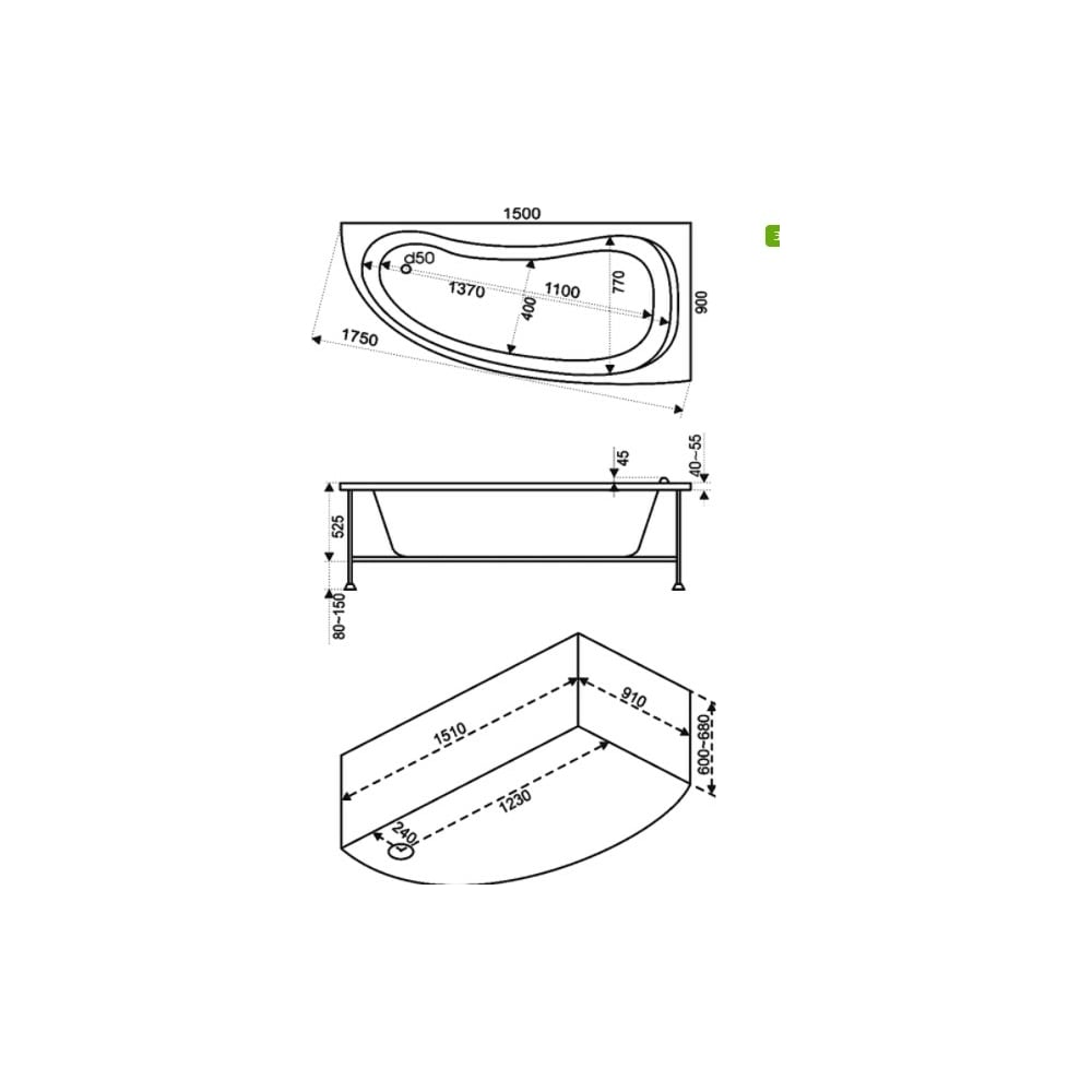 Ванна BAS Алегра правая 1500х900 каркас, комплект д/с В 00002