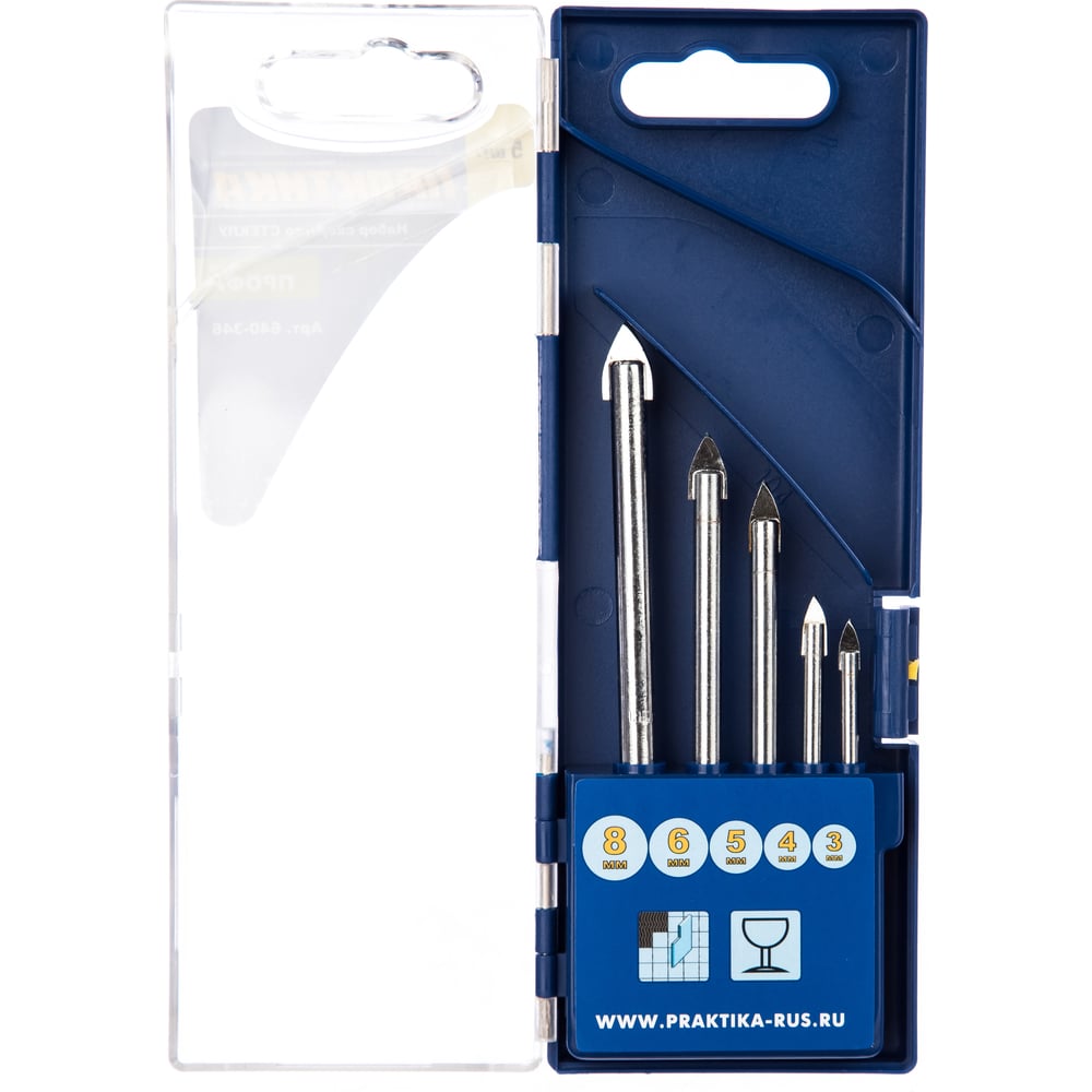 Набор сверл по стеклу и керамике Профи (5 шт; 3, 4, 5, 6, 8 мм) ПРАКТИКА 640-346