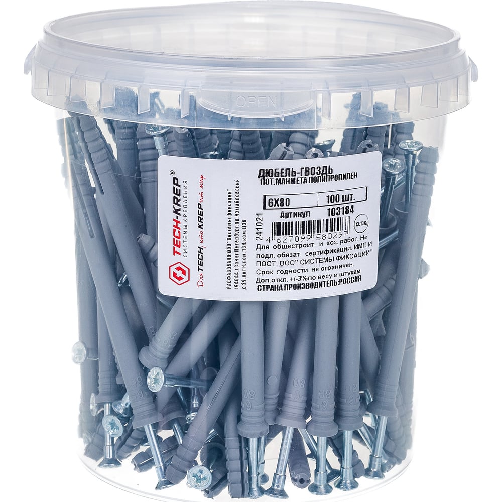 Дюбель-гвоздь 6х80 потайная манжета, полипропилен 100шт - ведро Tech-Krep 103184