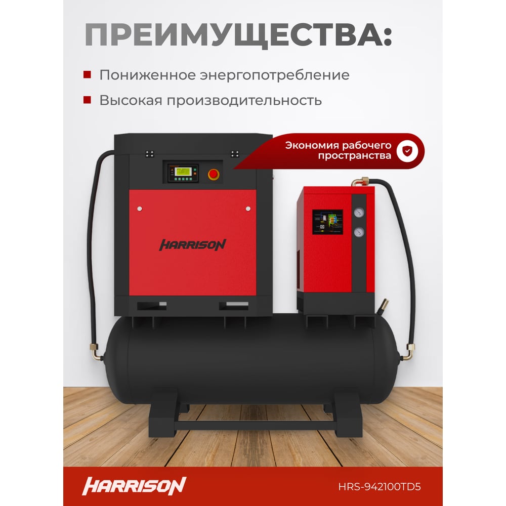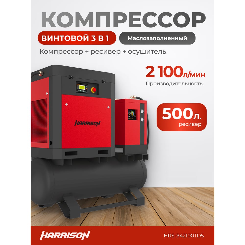 Винтовой компрессор HARRISON с осушителем и ресивером 500 л, 2100 л/мин, 10 бар, 15 кВт HRS-942100TD5