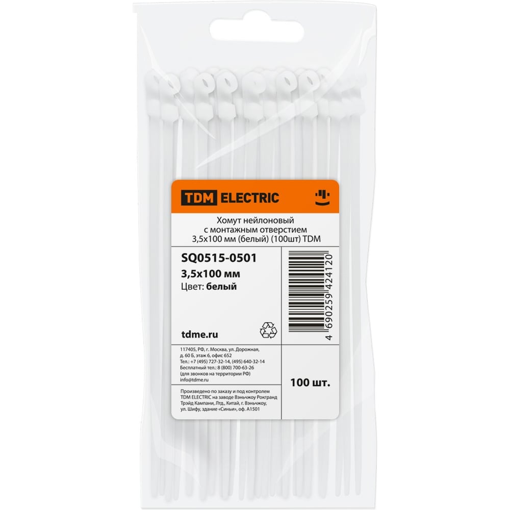Нейлоновый хомут с монтажным отверстием TDM ELECTRIC 3,5х100 мм, белый, 100 шт. SQ0515-0501