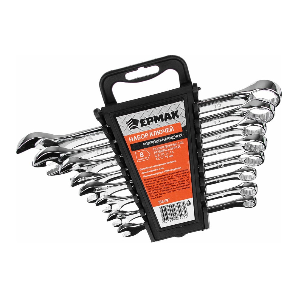 Набор рожково-накидных ключей ЕРМАК 8 предметов 8-19мм, полированные CRV, пластик холдер 736-097
