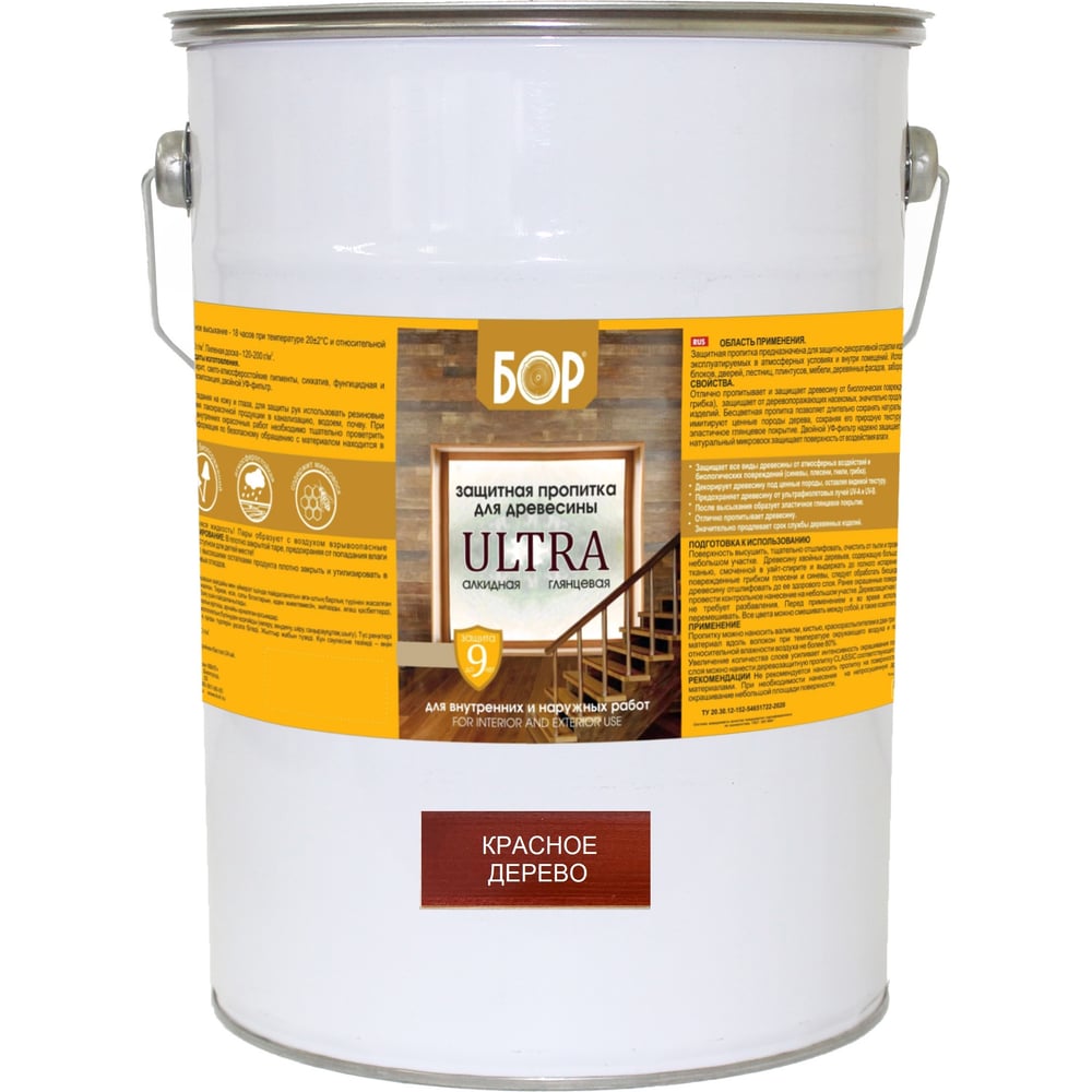 Защитная пропитка для дерева Бор Ultra для наружных работ, красное дерево 8 кг 4690417079544