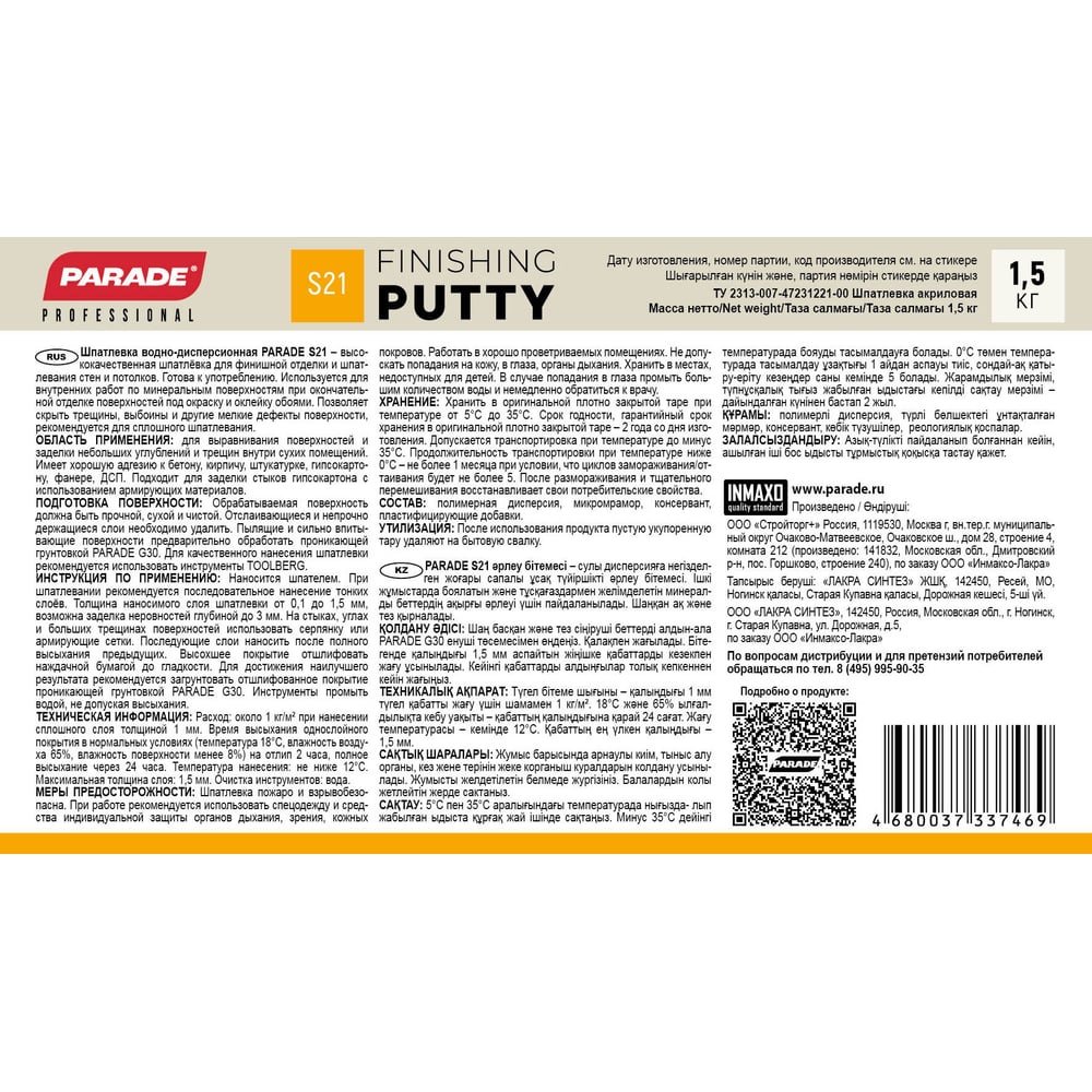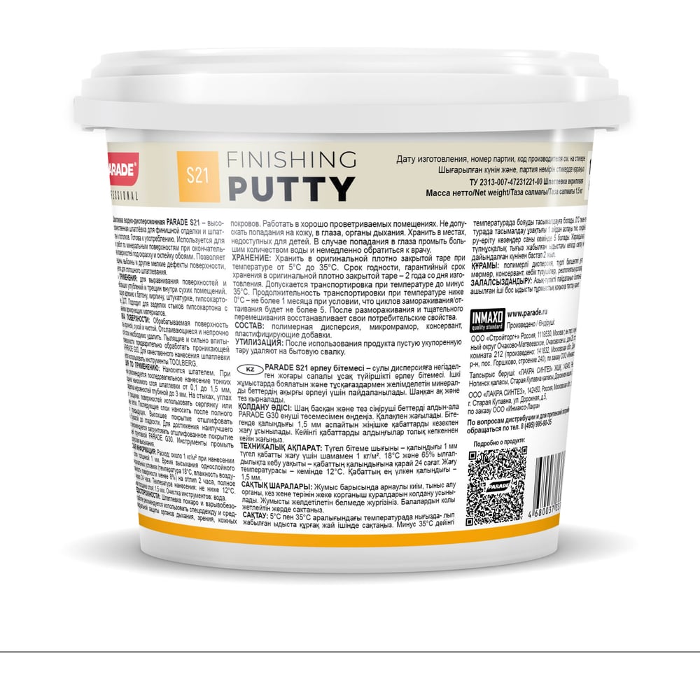 Шпатлевка акриловая PROFESSIONAL S21 финишная 1,5 кг Россия PARADE Лк-00011759