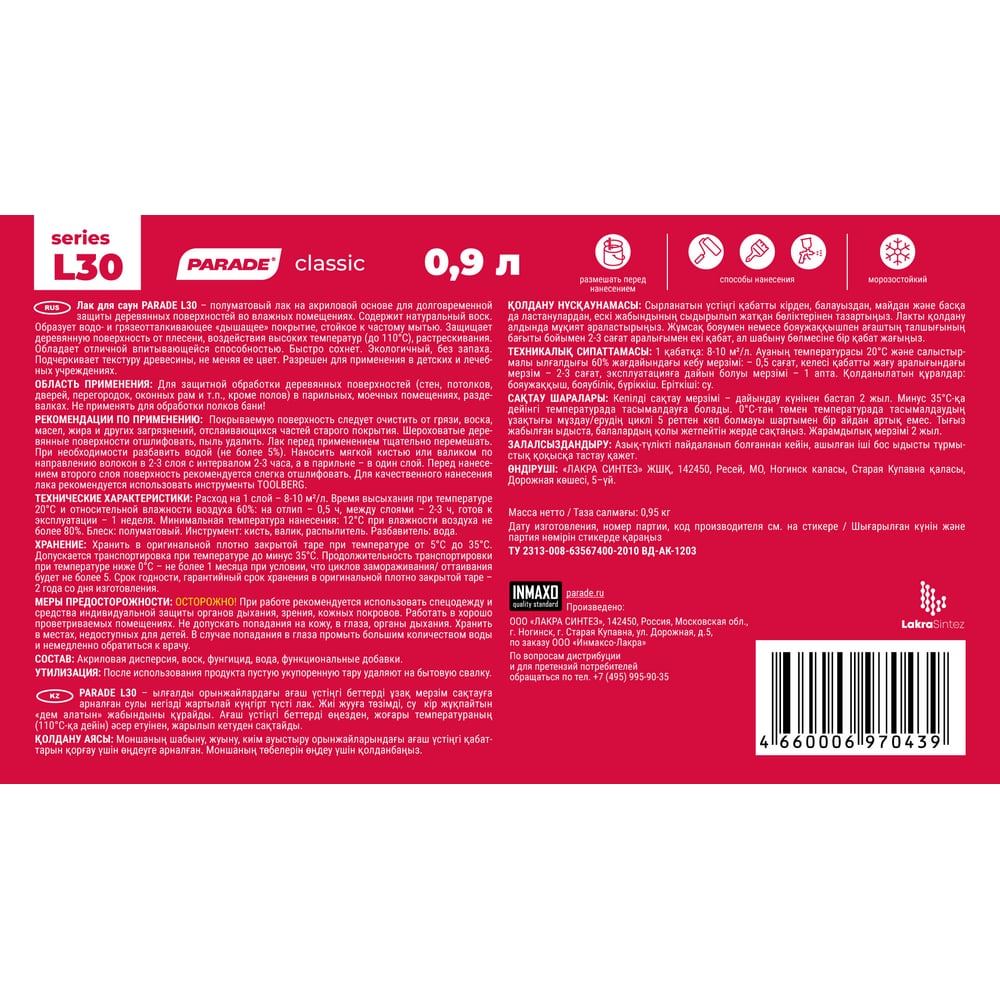 Лак для саун акриловый PARADE L30 Сауна & Баня п/мат 0,9 л Россия 90003239880