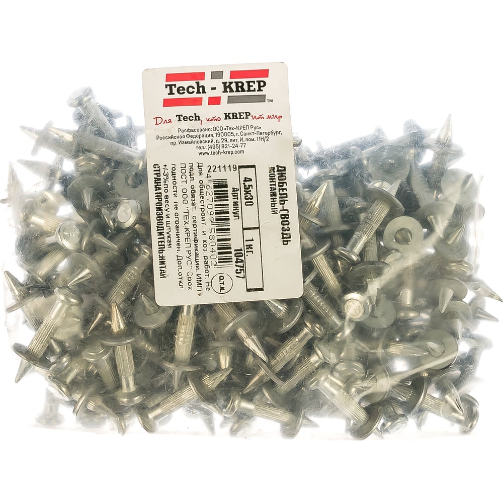 Монтажный дюбель-гвоздь 4.5х30, 1кг (186 шт.) - пакет Tech-Krep 104757