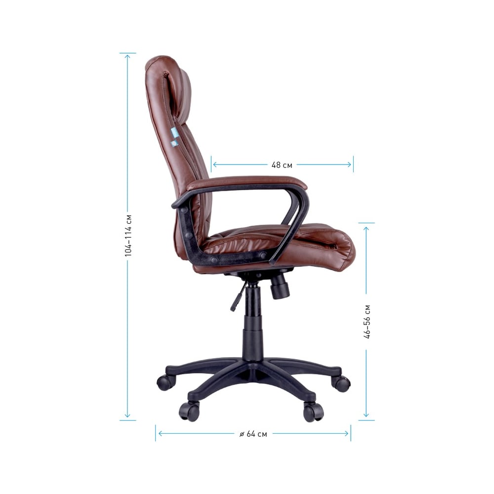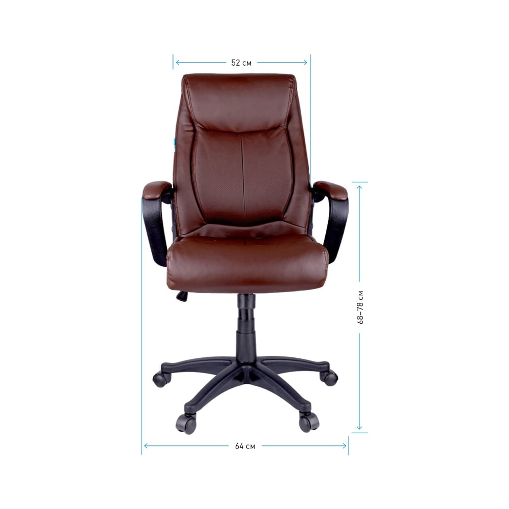 Габариты без упаковки 1040/1140х640х640 мм Вес нетто 15 кг Регулировка высоты сиденья да Требует сборки да Подлокотники да Подъемный механизм да Механизм качания да Регулировка высоты спинки нет Регулировка высоты подлокотников нет Механизм вращения да Подголовник да Регулировка наклона спинки да Подставка для ног нет Max нагрузка 120 кг Ширина сиденья 520 мм Глубина сиденья 480 мм Ширина спинки 520 мм Высота спинки 580 мм Min высота сиденья 460 мм Мах высота сиденья 560 мм Поясничный упор есть Цвет спинки коричневый Материал крестовины пластик Материал подлокотников Пластик/экокожа Цвет сиденья коричневый Материал обивки экокожа