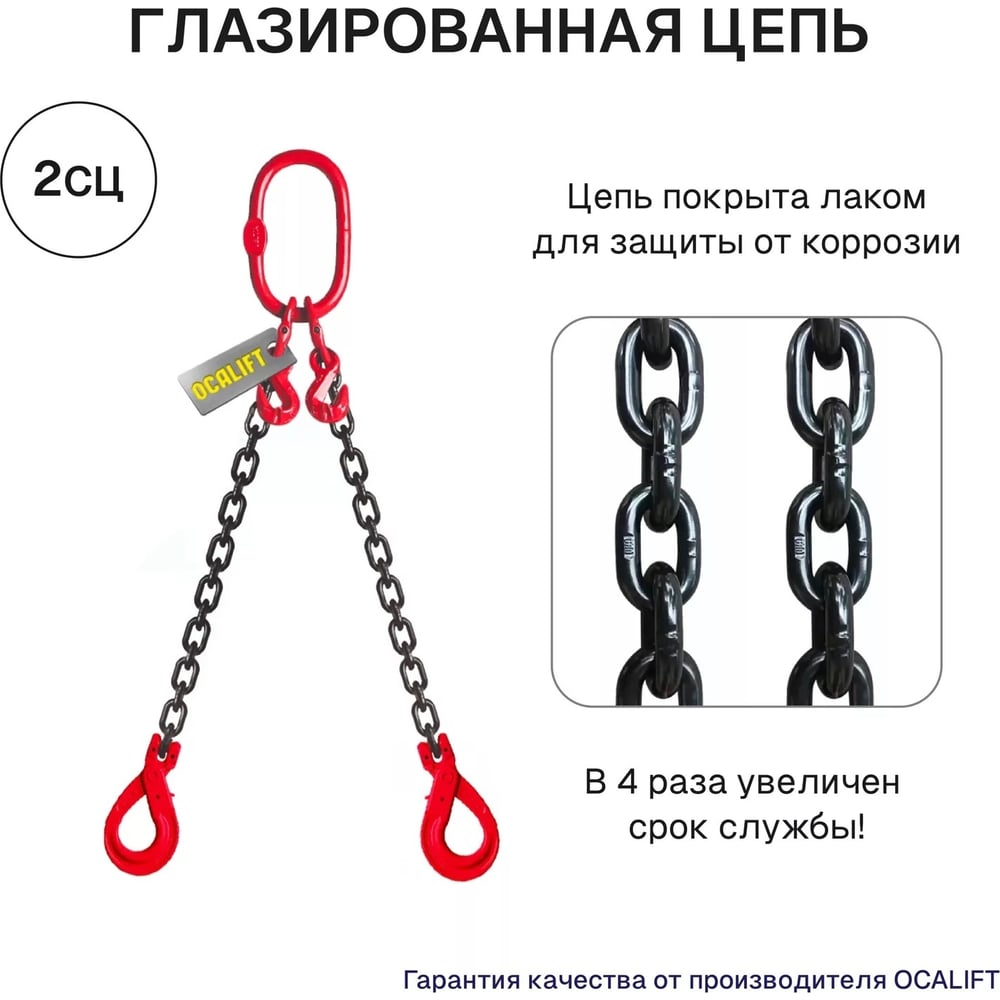 Цепной строп OCALIFT 2СЦ 7,5т 3м с самозакрывающимися крюками двухветвевой цепь глазированная 13x39 T8 G80 2sc7500t3sf