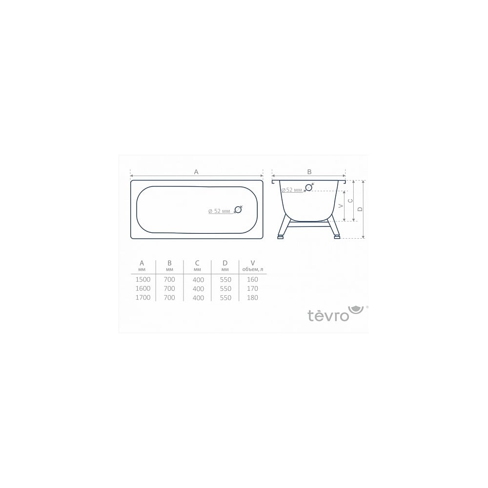 Стальная ванна ВИЗ TEVRO 160х70х40 см, с опорной подставкой, без ранта, белый лотос Т-62902