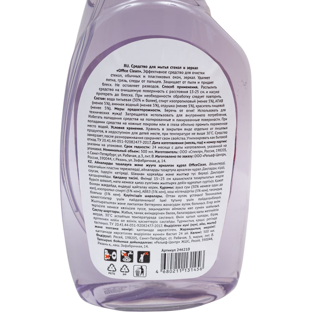 Объем 0.5 л Вес нетто 0.5 кг Без запаха нет Состав вода питьевая (30% и более), спирт изопропиловый (менее 5%),аммиак водный (менее 5%), АПАВ (менее 5%), отдушка (менее 5%), краситель пищевой (менее 5%). Форма выпуска спрей Тип упаковки бутылка С распылителем есть Наличие спирта есть Без разводов да Нашатырный спирт есть Антидождь нет