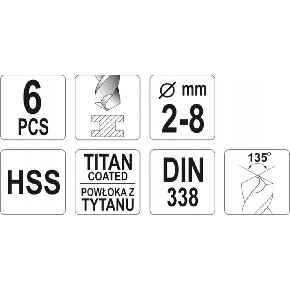 Набор сверл по металлу HSS-TiN 2-8 мм, 6 предметов YATO YT-44673