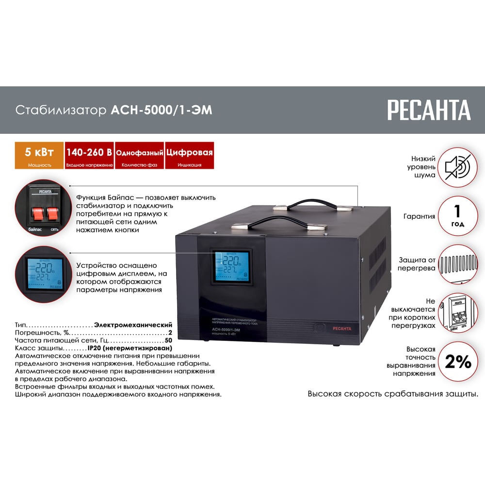Стабилизатор напряжения однофазный Ресанта АСН 5000/1-ЭМ 63/1/6