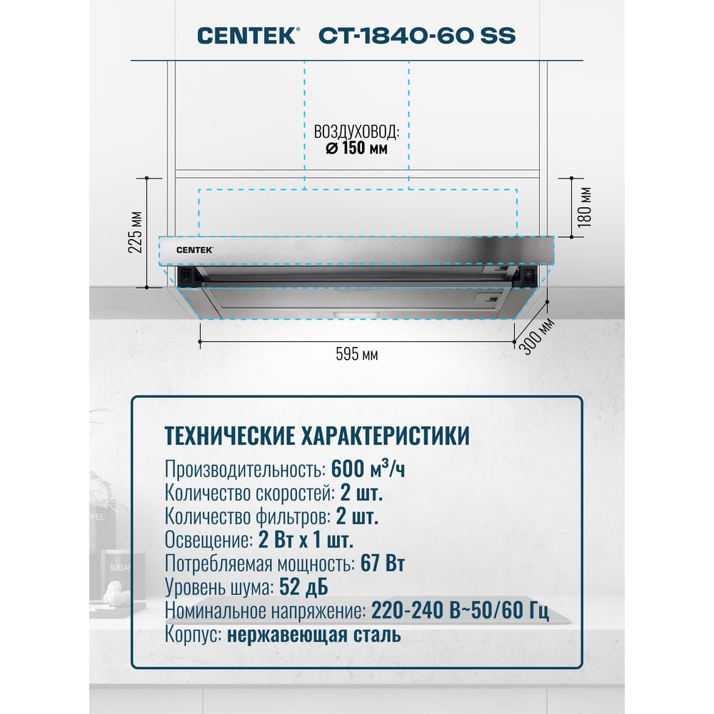 Вытяжка Centek сталь, ширина 60 см, слайдер, 600 м3/час, 225 Вт, диаметр 150 мм, СТ-1840-60 SS