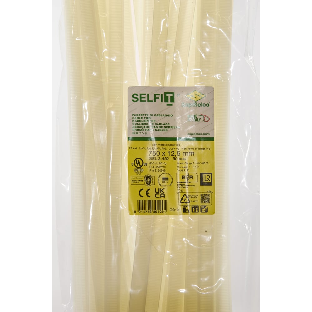 Стяжки натурального цвета SapiSelco 12.5х750 мм, полиамид 6.6, уп. 50 шт. SEL.2.452R