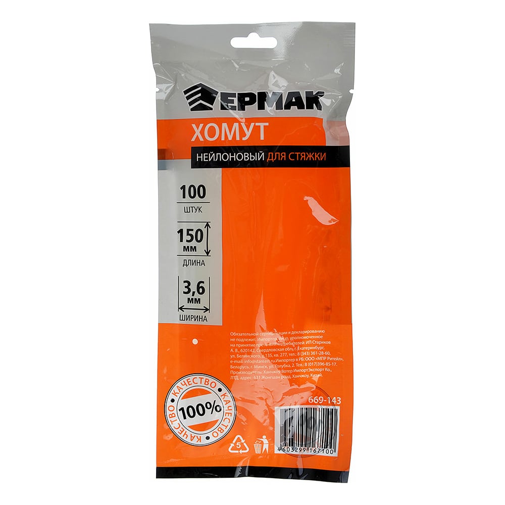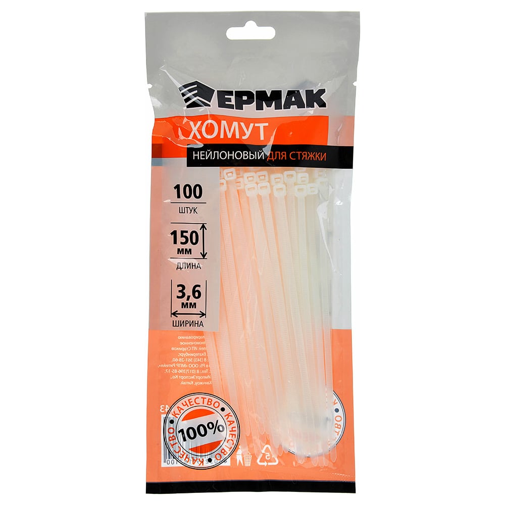 Нейлоновый хомут для стяжки ЕРМАК 3,6х150 мм, белый, 100 шт. 669-143