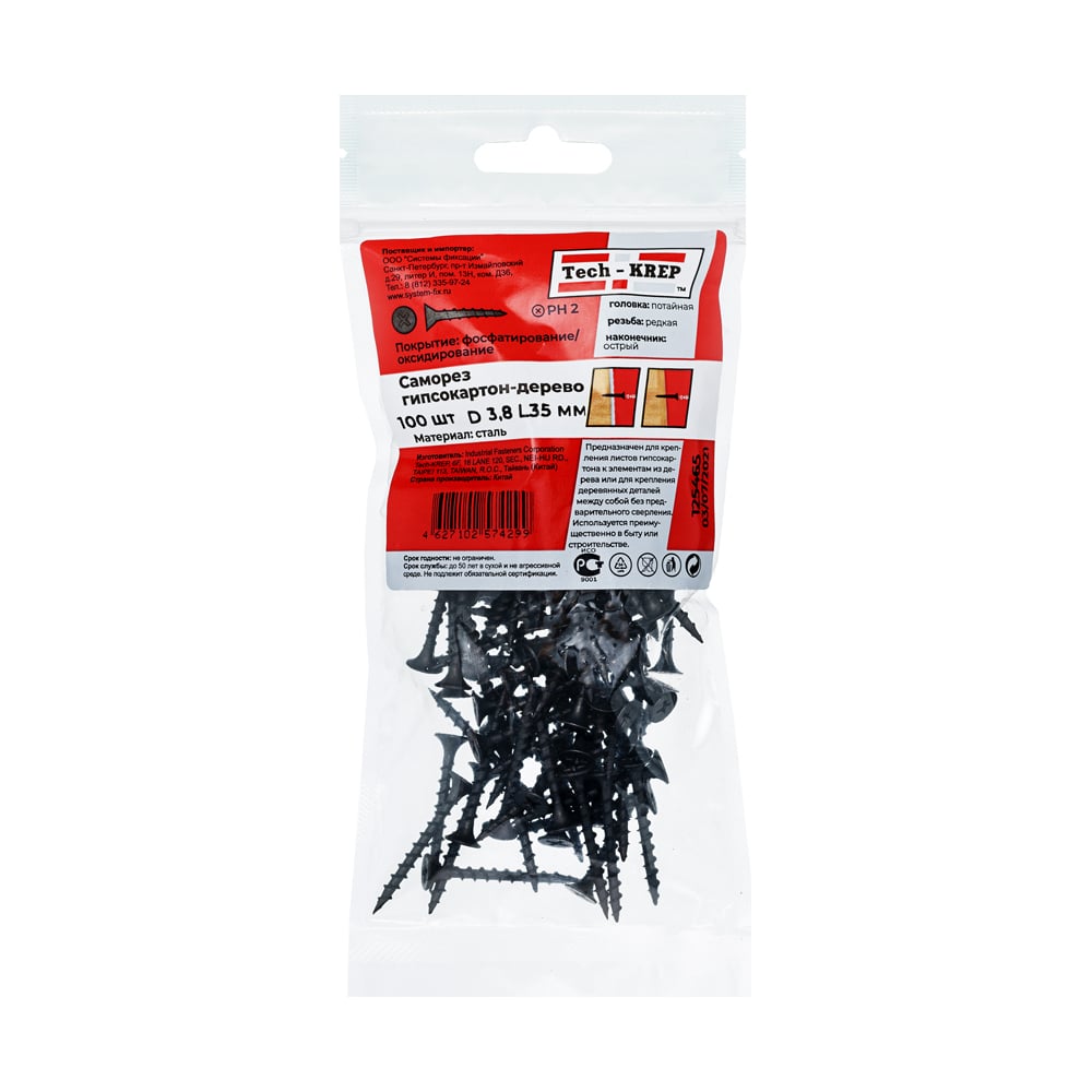 Саморезы гипсокартон-дерево 3.8х35, 100 шт - пакет Tech-Krep 125465