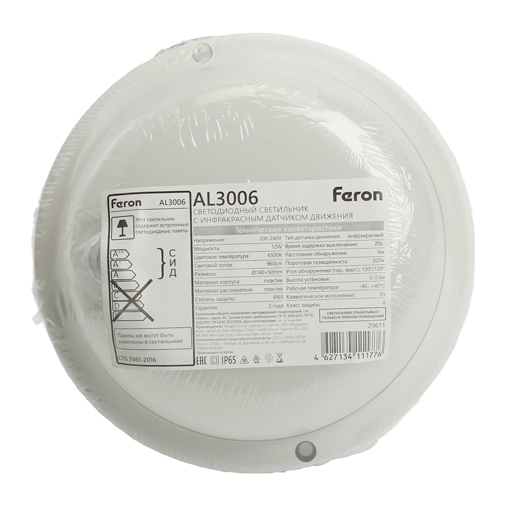 Светодиодный светильник FERON пылевлагозащищённый c ИК-датчиком, AL3006 29611