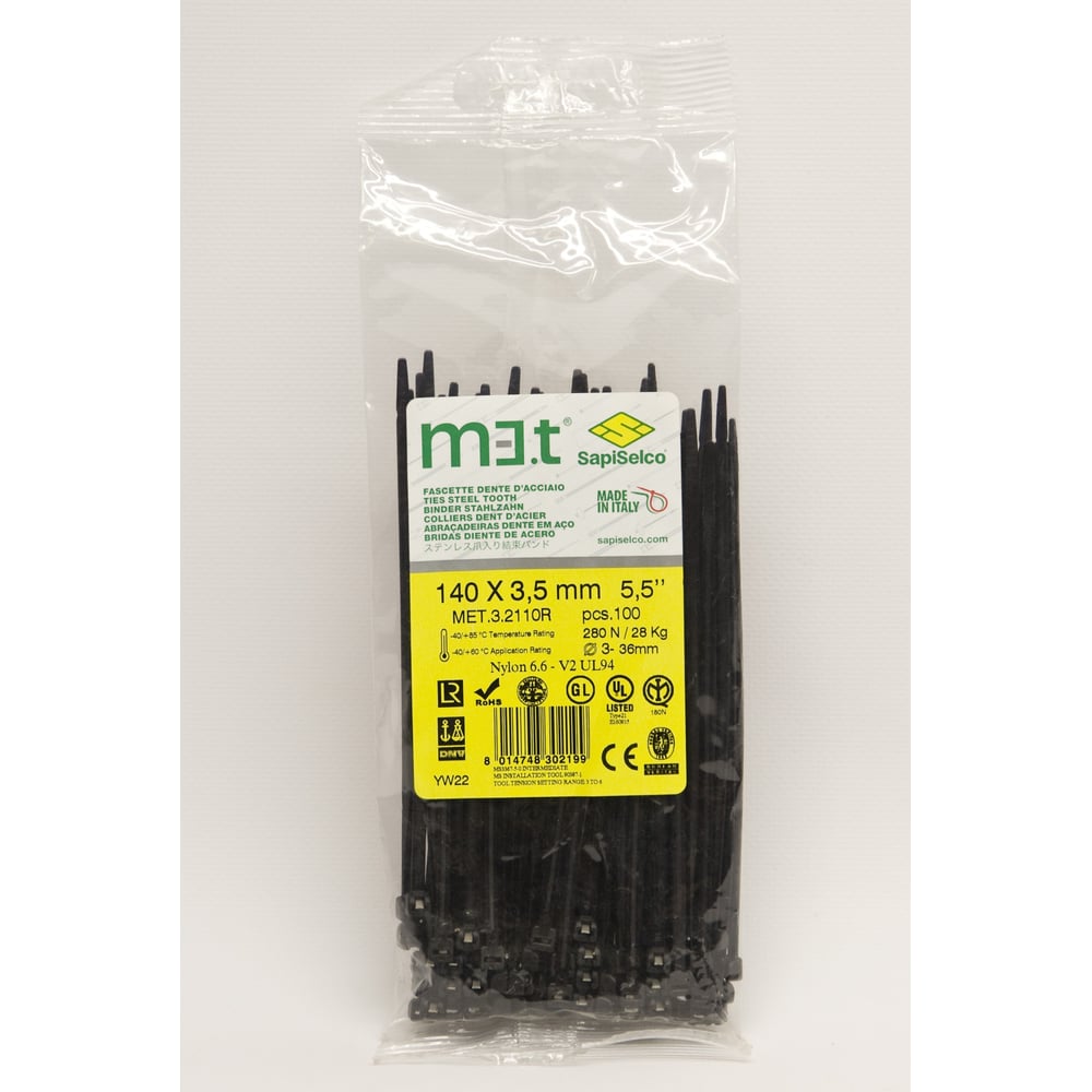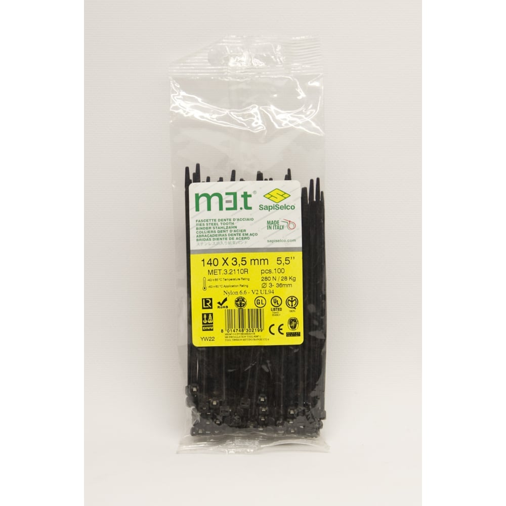 Стяжки с металлической вставкой в головке SapiSelco ME.T, черного цвета, 3.5x140, полиамид 6.6, уп.100 шт. MET.3.2110R