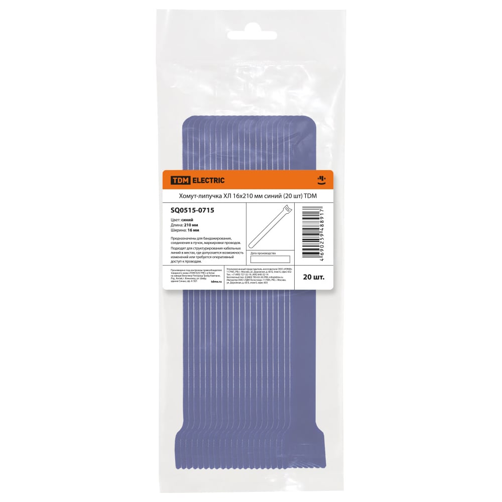 Хомуты для проводов (липучка) TDM ELECTRIC ХЛ 16х210 мм синий упаковка 20 штук SQ0515-0715