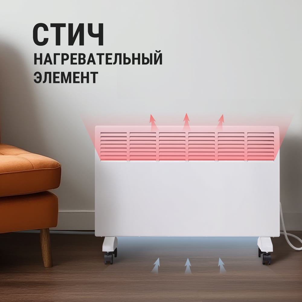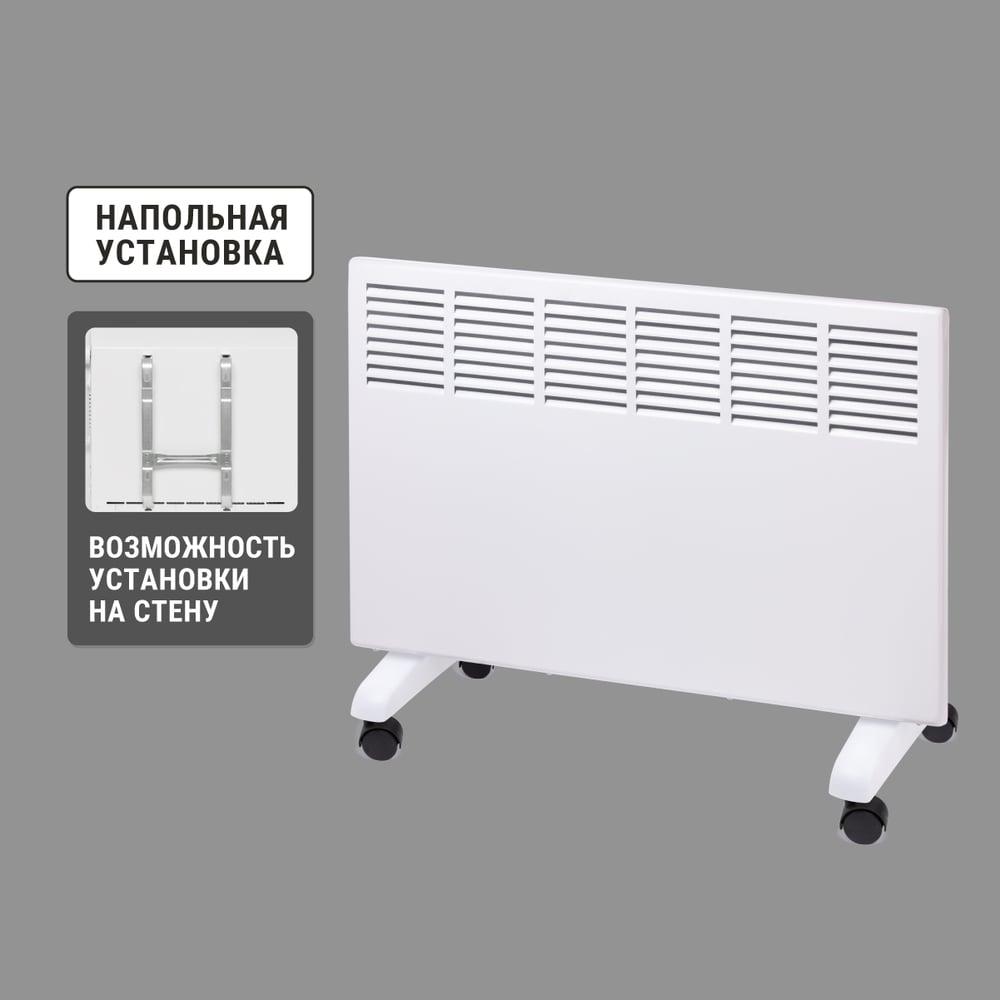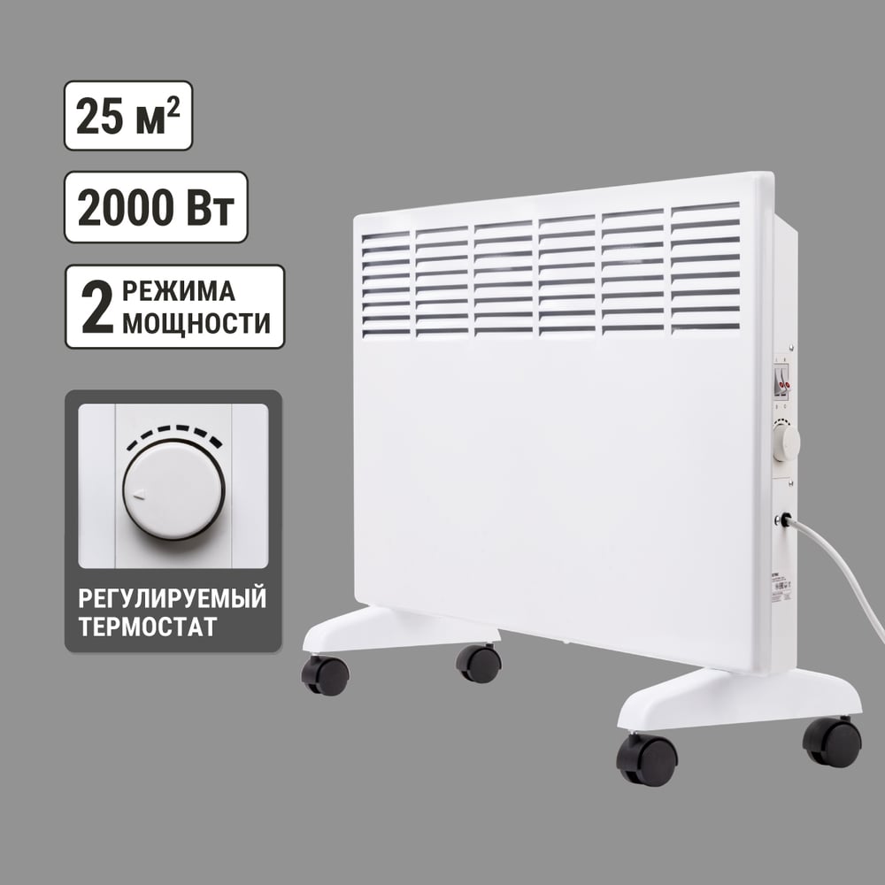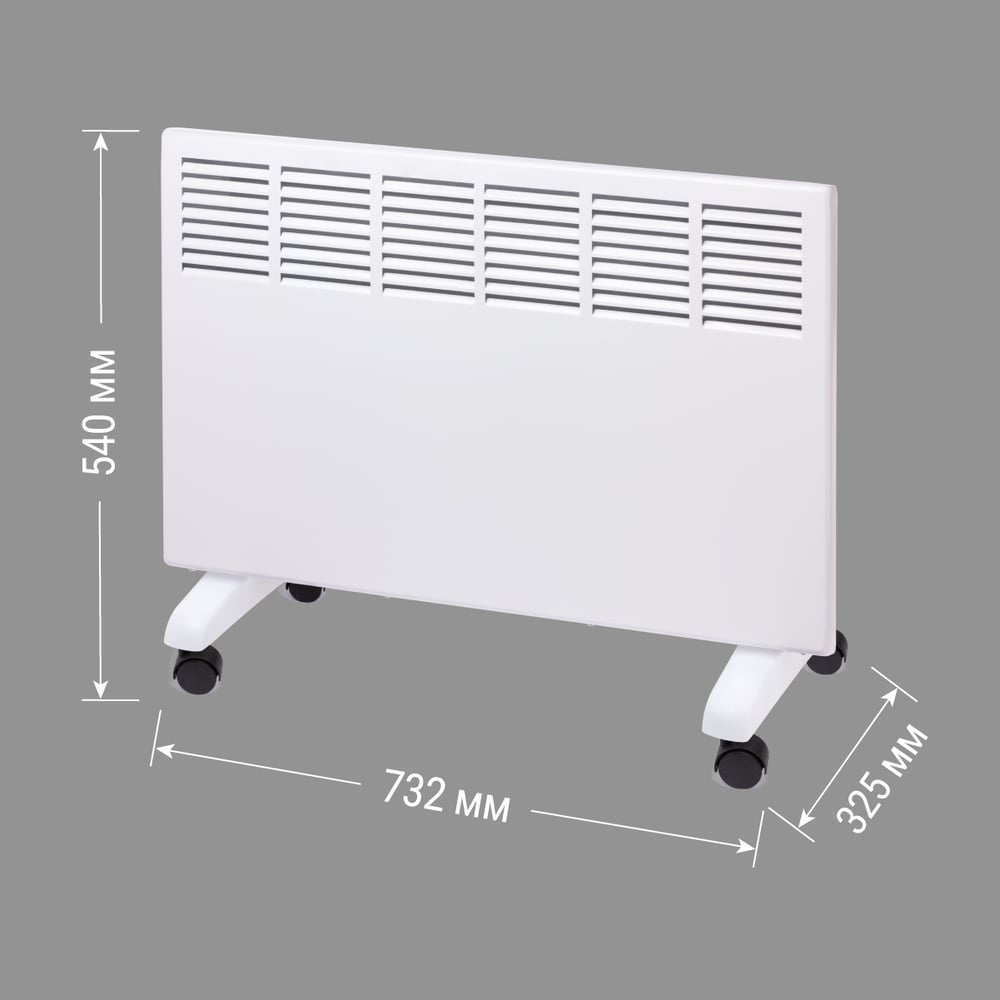 Габариты без упаковки 732х325х540 мм Высота 325 мм Ширина 732 мм Цвет белый Вес нетто 4.8 кг Материал корпуса металл/пластик Вид крепления настенный/напольный Серия ЭК-2000С Степень защиты IP22 Напряжение 220 В Глубина 540 мм Световая индикация есть Заземление нет Дисплей нет Рекомендуемая площадь 20 м² Max мощность 2 кВт Наличие сетевой вилки есть Поддержка Wi-fi нет Защита от перегрева да Встроенный вентилятор нет Инверторная технология нет Вид термостата механический Ножки в комплекте есть Тип нагревательного элемента стич (игольчатый, лентообразный) Длина шнура 1.35 м Количество режимов мощности 2 шт Для системы Умный дом нет Ступени мощности 1/2 кВт Пульт ДУ в комплекте нет Антизамерзание нет