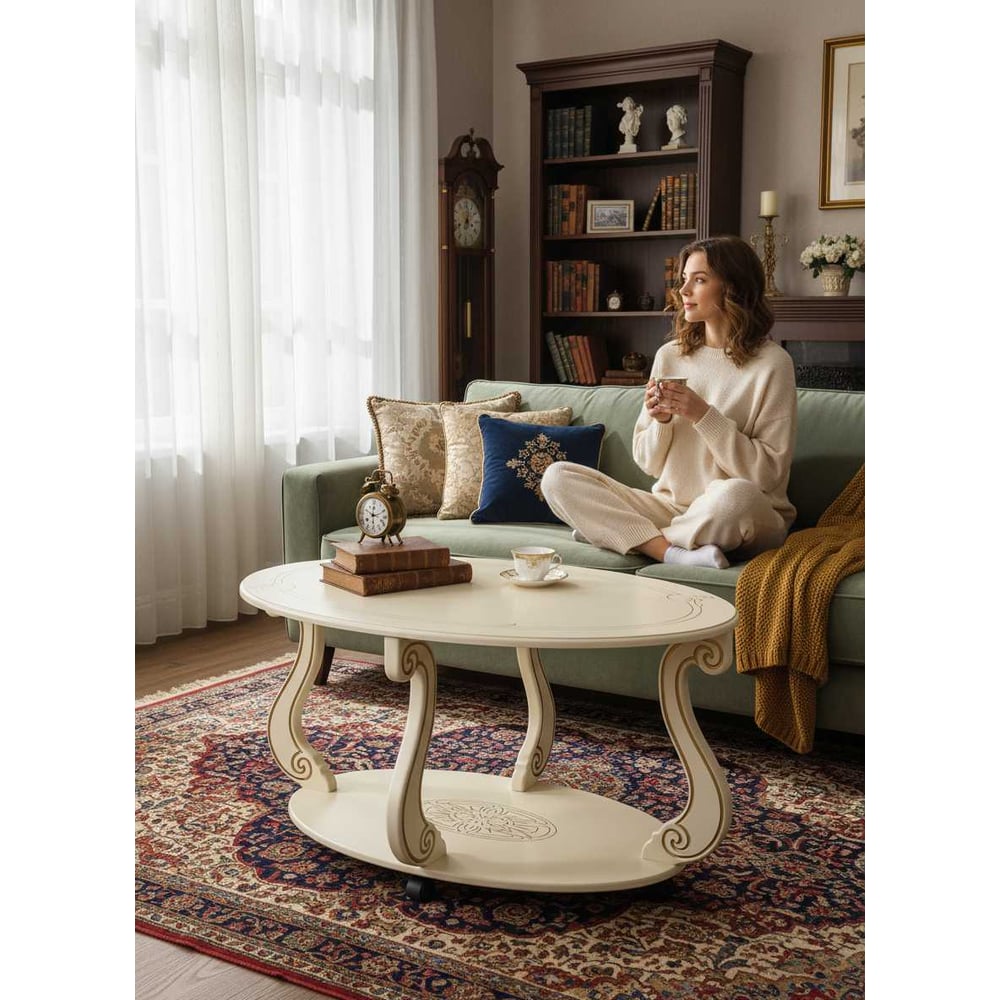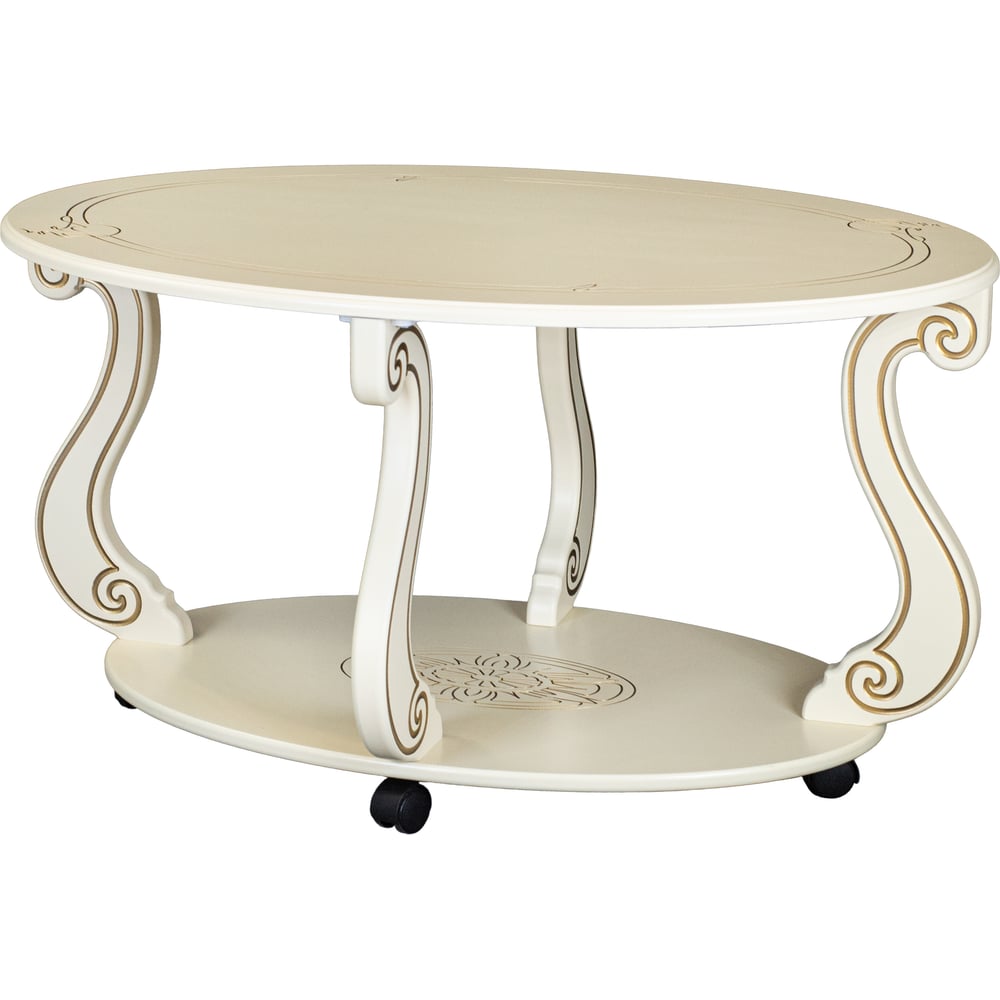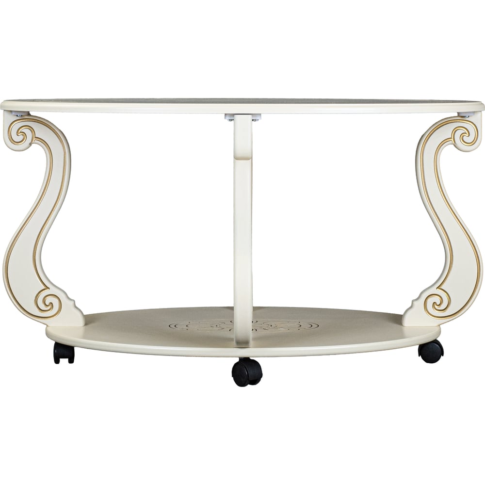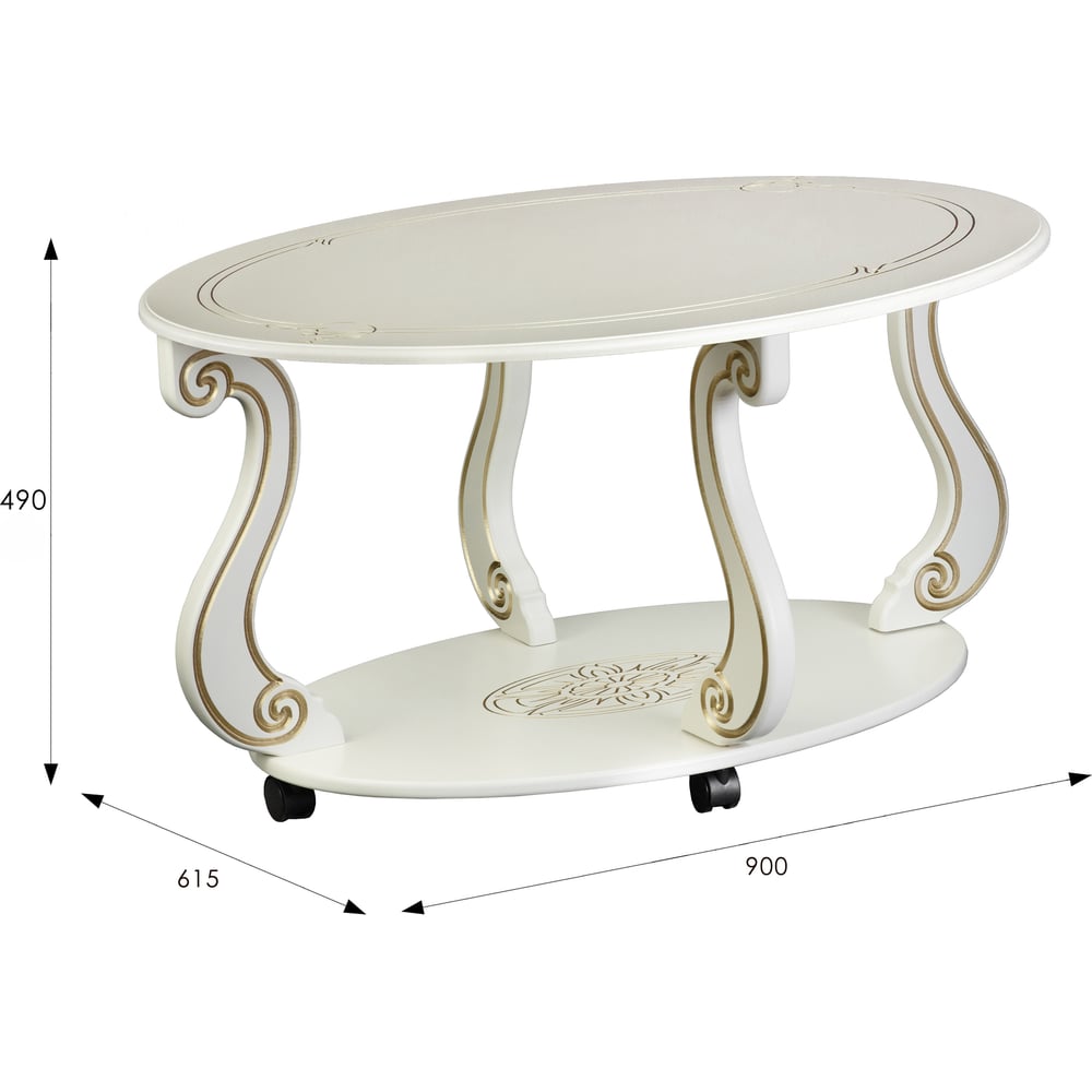 Высота 490 мм Длина 615 мм Покрытие глянцевое Ширина 900 мм Вес нетто 12 кг Стиль классический Форма овал Max нагрузка 20 кг Складной нет Колесики есть Материал столешницы МДФ Тип стола журнальный Материал ножек МДФ Цвет столешницы слоновая кость, золото Цвет ножек слоновая кость, золото Двойные нет Количество ножек 4 шт Полки есть