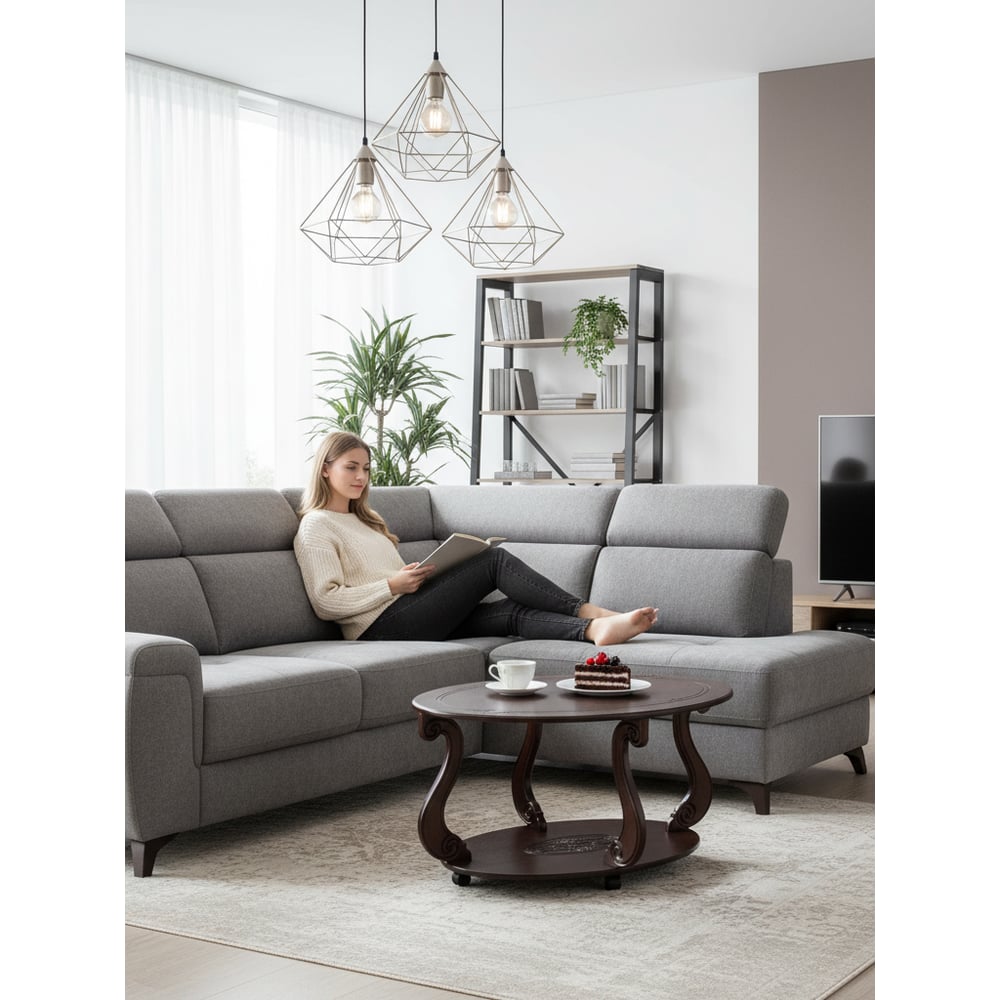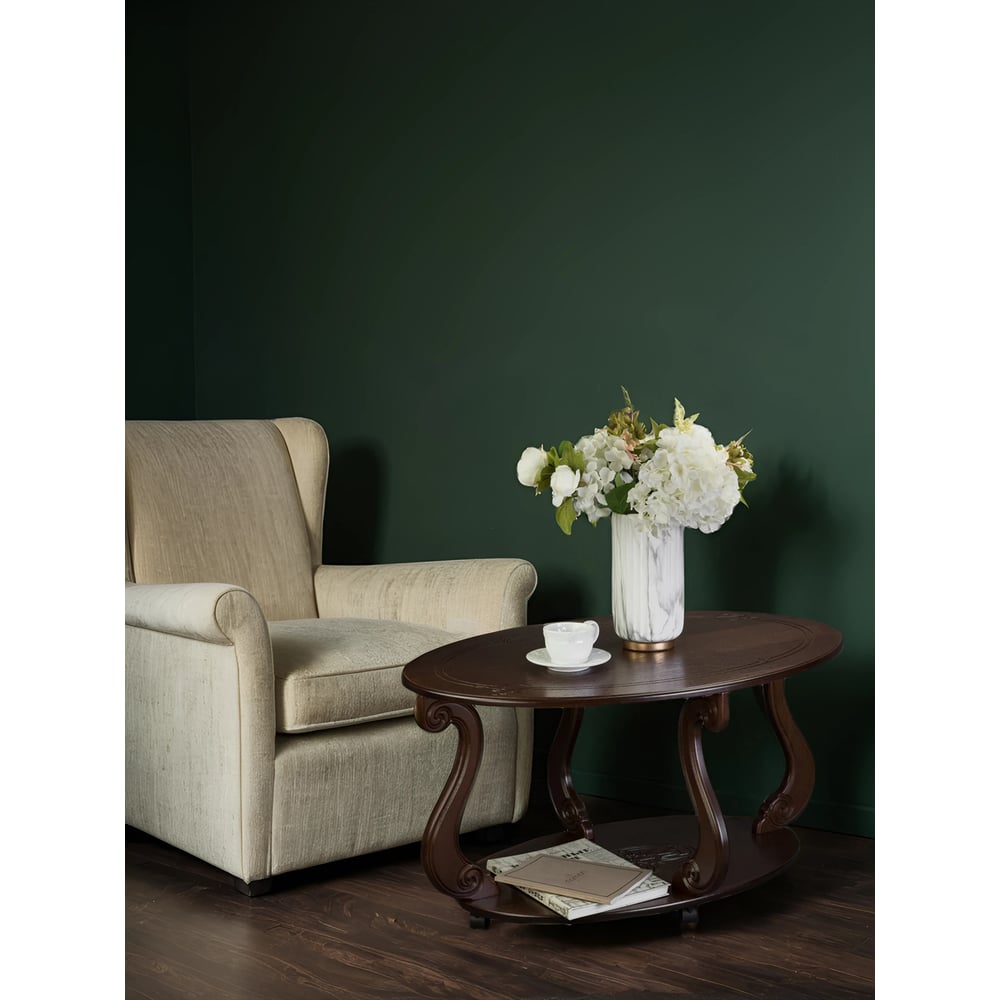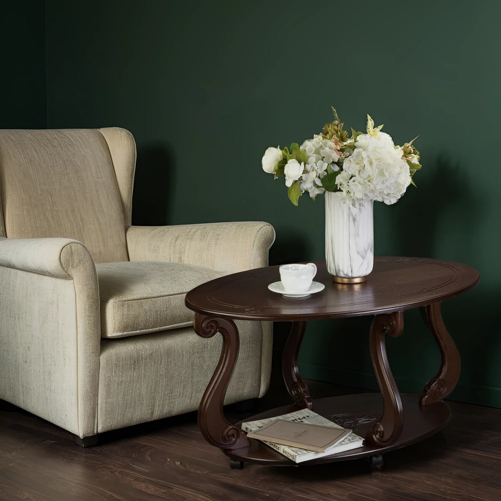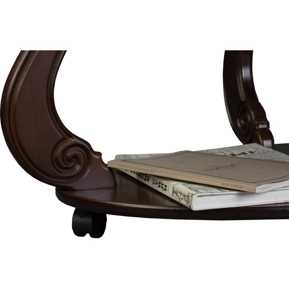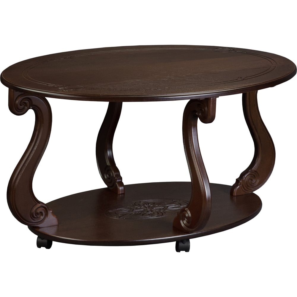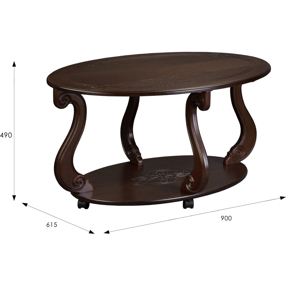 Высота 490 мм Длина 615 мм Покрытие глянцевое Ширина 900 мм Вес нетто 12 кг Стиль классический Форма овал Max нагрузка 20 кг Складной нет Колесики есть Материал столешницы МДФ Тип стола журнальный Материал ножек МДФ Цвет столешницы темно-коричневый Цвет ножек темно-коричневый Двойные нет Количество ножек 4 шт Полки есть