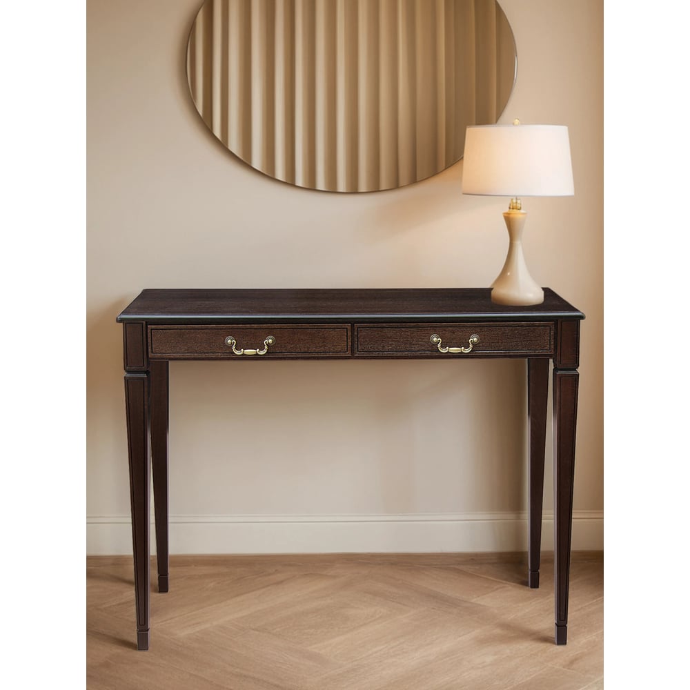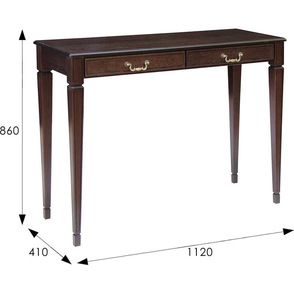 Габариты без упаковки 1120х410х860 мм Высота 860 мм Ширина 1120 мм Вес нетто 19.6 кг Подсветка нет Цвет фасада темно-коричневый Материал фасада дерево Количество ящиков 2 Глубина 410 мм Требует сборки да Толщина столешницы 16 мм Материал столешницы ЛМДФ Цвет столешницы темно-коричневый Материал каркаса дерево Цвет каркаса темно-коричневый Зеркало в комплекте нет