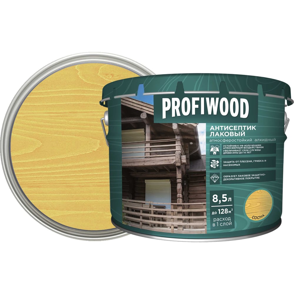 Алкидный антисептик PROFIWOOD (лаковый; тонирующий; атмосферостойкий; сосна; 8.5 л; 8 кг) 67016