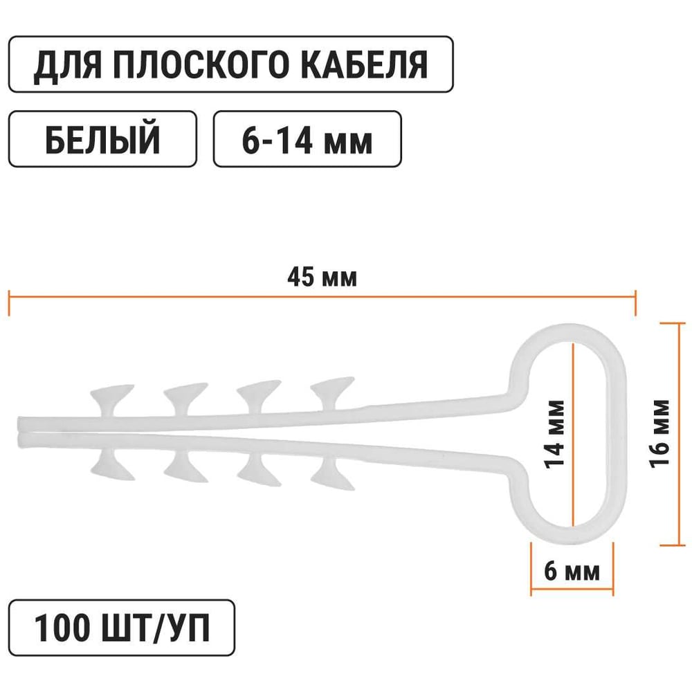Тип фасовки шт. Материал нейлон Цвет белый Тип дюбель-хомут Фасовка 100 шт Метиз в комплекте нет Вид дюбель-хомута для плоского кабеля Размер плоского кабеля 6х14 мм