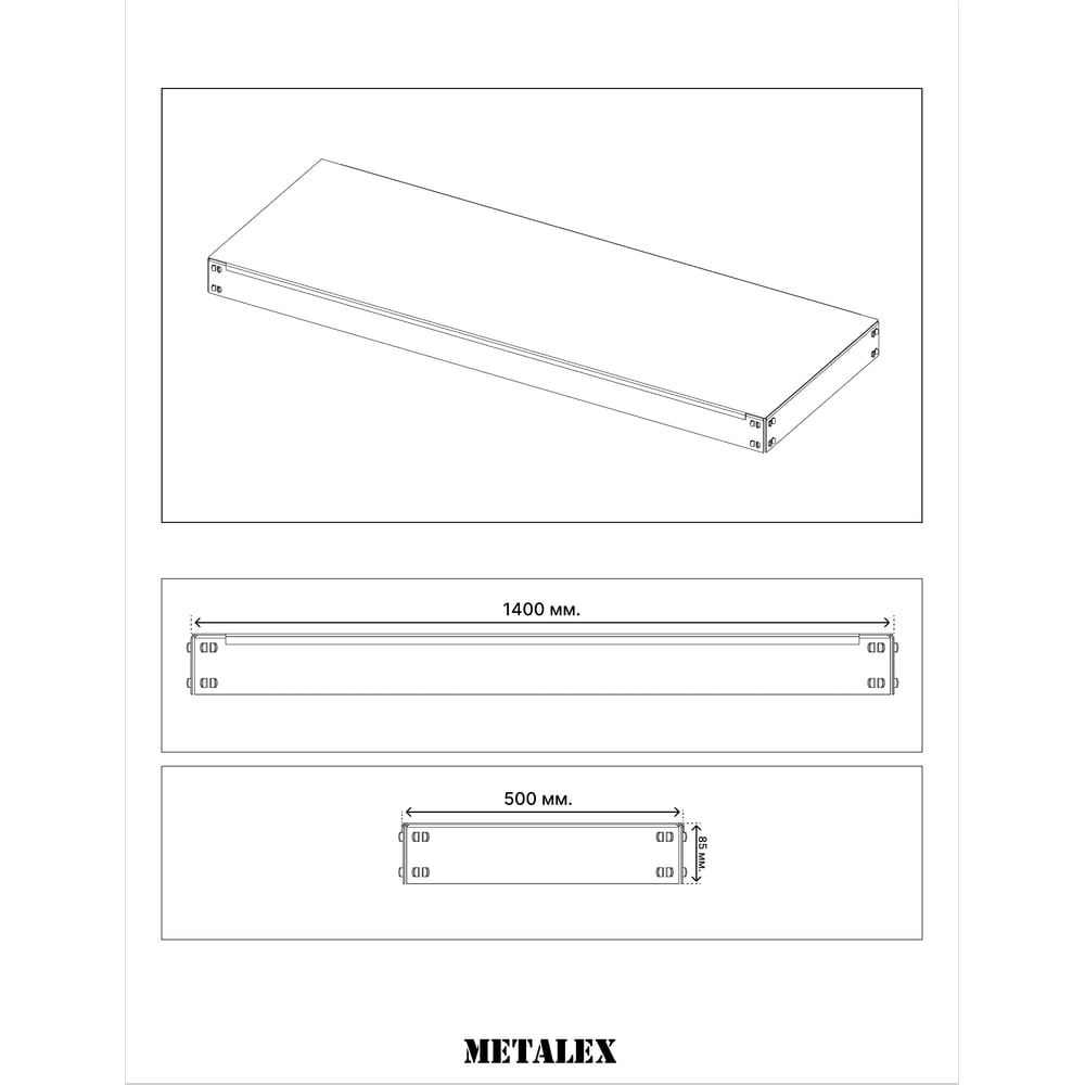 Габариты без упаковки 1400х500х30 мм Высота 30 мм Материал металл Ширина 1400 мм Вид полка Класс товара Бытовой Глубина 500 мм Магнитная нет Max нагрузка на полку 350 кг