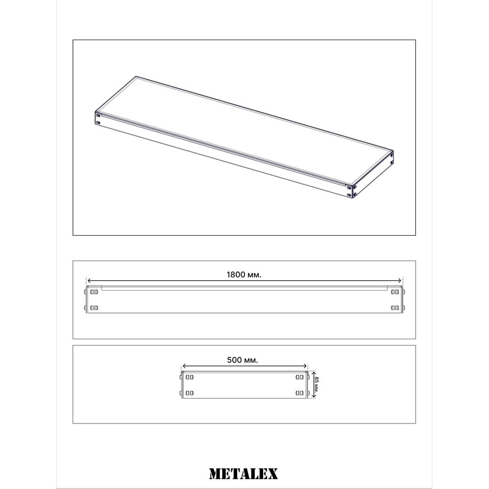 Габариты без упаковки 1800х500х30 мм Высота 30 мм Материал металл Ширина 1800 мм Вид полка Класс товара Бытовой Глубина 500 мм Магнитная нет Max нагрузка на полку 350 кг