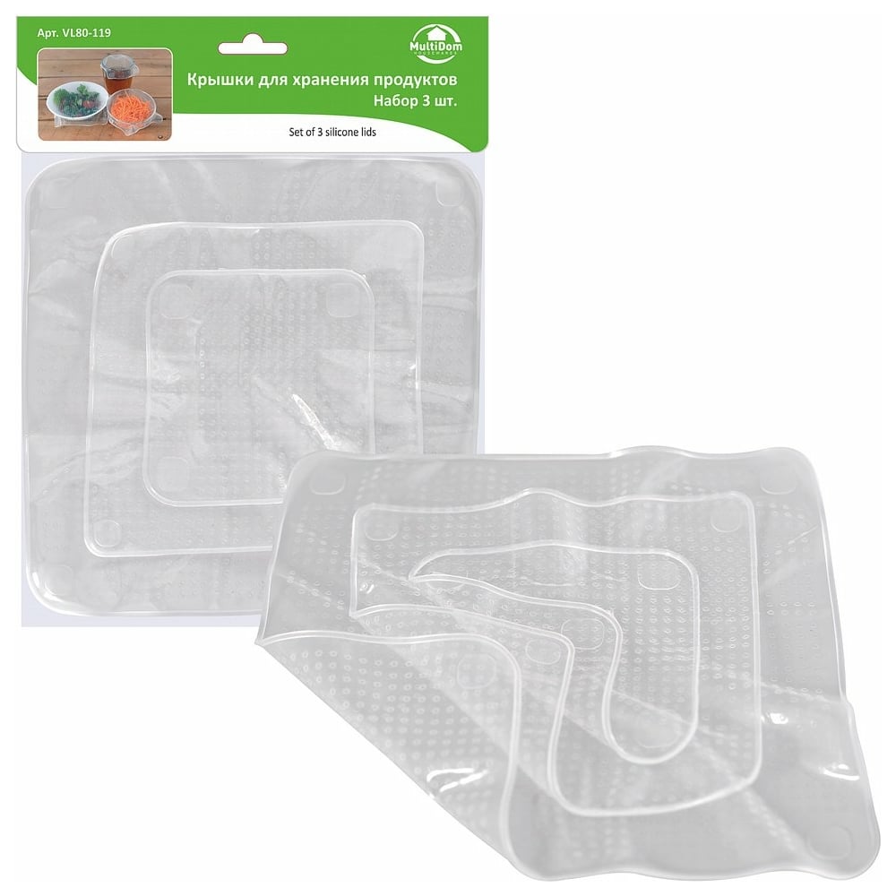 Крышки для хранения продуктов МУЛЬТИДОМ набор 3 шт размеры 9,5x9,5 см, 13,5x13,5 см, 18,5x18,5 см VL80-119