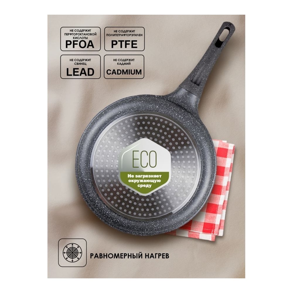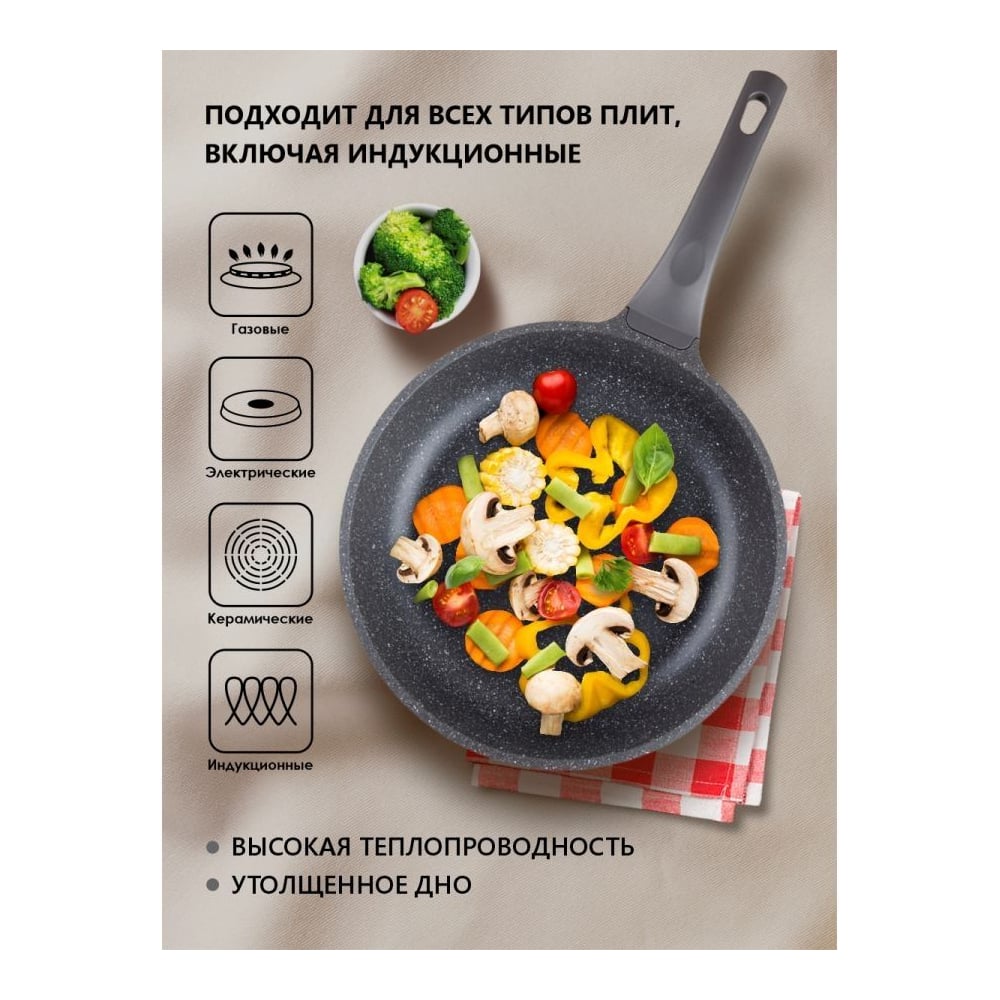 Высота 55 мм Длина 240 мм Материал литой алюминий Объем 1.8 л Ширина 240 мм Цвет серый гранит/мрамор Тип универсальная Вес нетто 1.02 кг Форма круглая Тип ручки несъемная ручка Материал крышки нет Материал рукояти бакелит/покрытие "Софт-тач" Для газовых плит да Для индукционных плит да Для электрических плит да Ненагревающаяся ручка да Мойка в посудомоечной машине да Индикатор нагрева нет Внешний диаметр 24 см Толщина дна 4.5 мм Антипригарное покрытие тефлон Крышка в комплекте нет Количество ручек 1 Диаметр дна 24 мм Толщина стенок 1.8 мм Выпускной клапан у крышки нет Для стеклокерамических плит да Можно использовать в духовке нет