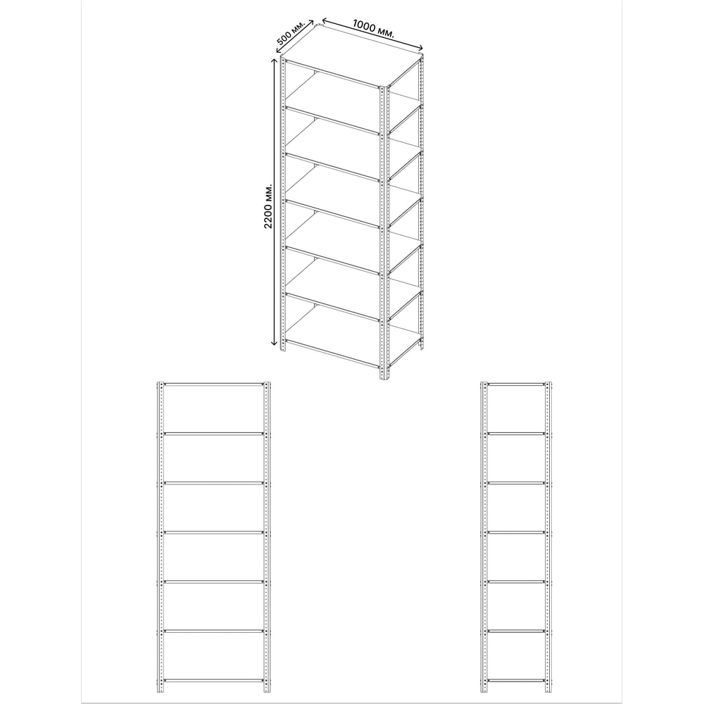 Габариты без упаковки 2200x1000x500 мм Высота 2200 мм Материал сталь Покрытие порошковое Ширина 1000 мм Цвет серый, зеленый Вид стеллаж Класс товара Бытовой Установка напольный Глубина 500 мм Конструкция стационарный Сборные нет Max нагрузка на полку 100 кг Кол-во полок/ярусов 7 шт Шаг регулирования высоты полки 25 мм Вес стеллажа 22.5 кг Безболтовые нет