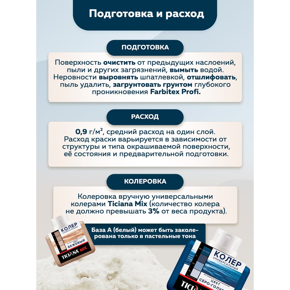| Система колеровки | Вручную универсальными колерами Ticiana Mix (количество колера не должно превышать 4% от веса продукта) |
