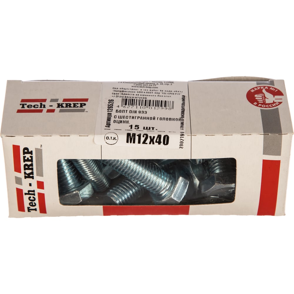 Болт DIN 933 с шестигранной головкой, оцинкованный М12х40, 15шт - коробка Tech-Krep 126526