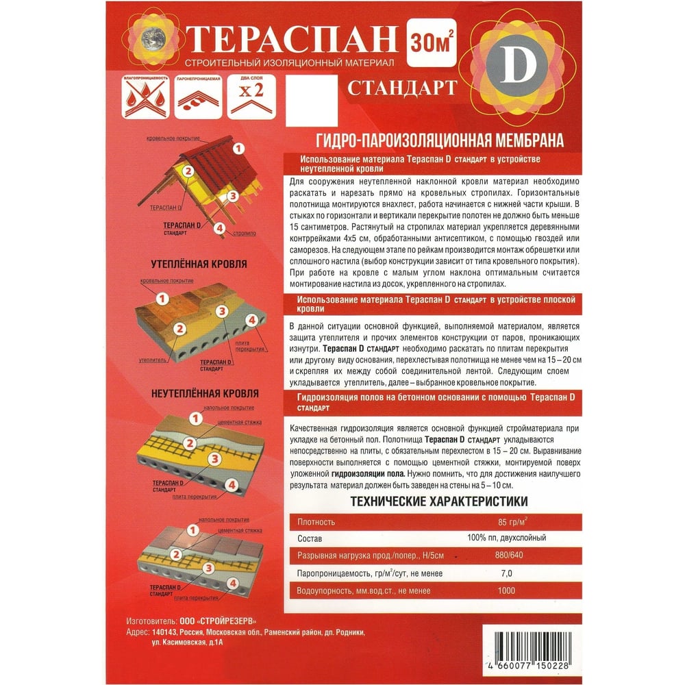 Двухслойный гидро-пароизоляционный материал ТЕРАСПАН Д СТАНДАРТ повышенной прочности, 30 кв. м 4660077150228