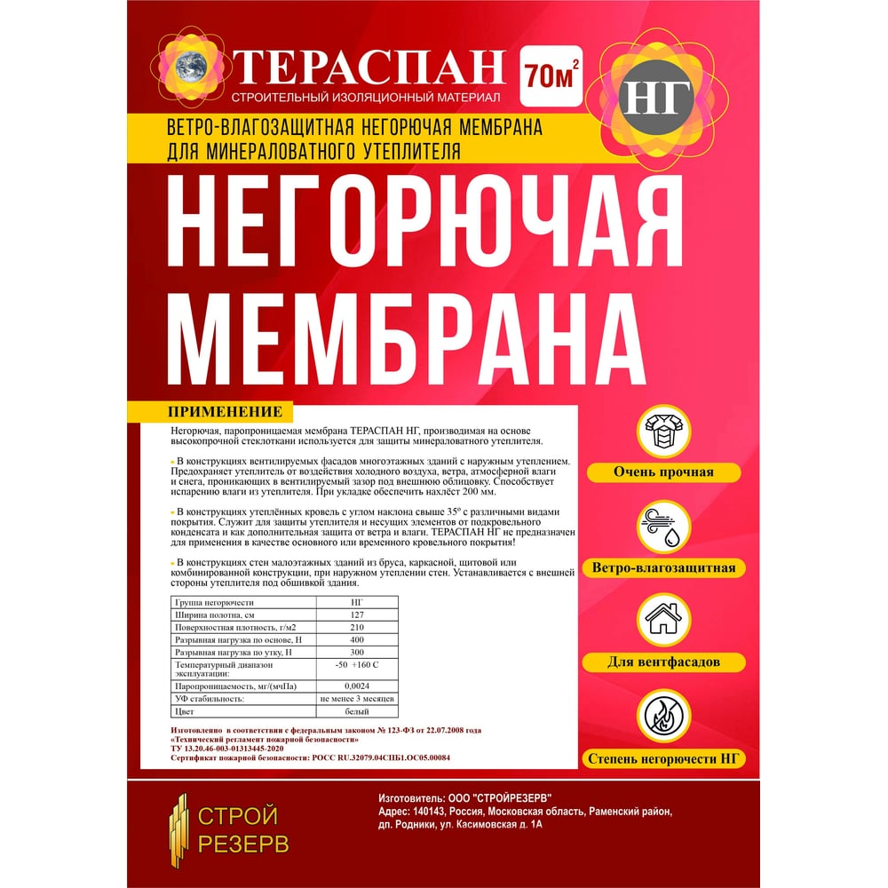 Строительный рулонный изоляционный материал Тераспан НГ белый, 70 кв. м, ветро-влагозащитная, негорючая мембрана 4660077151485