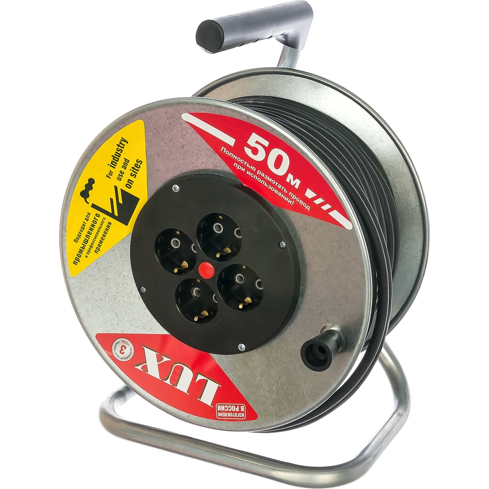 Силовой удлинитель на металлической катушке LUX К4-Е-50 50м 4 розетки с з/к 44150 4606400419457