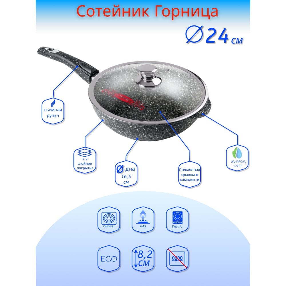 Сотейник Горница 240/82 мм, съемная ручка, антипригарное покрытие, с крышкой, гранит ПС7247
