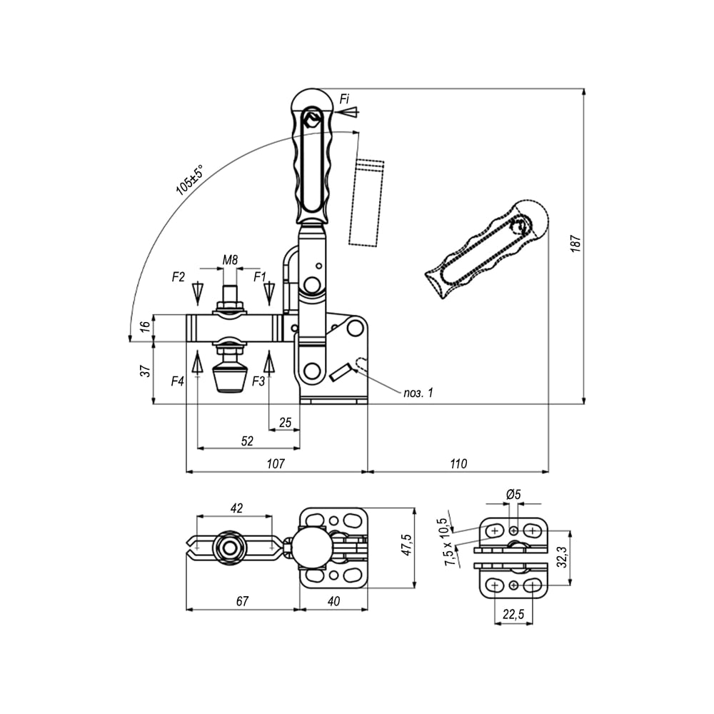 Прижим механический с горизонтальным основанием KUKAMET, усилие 255 кг 211-3