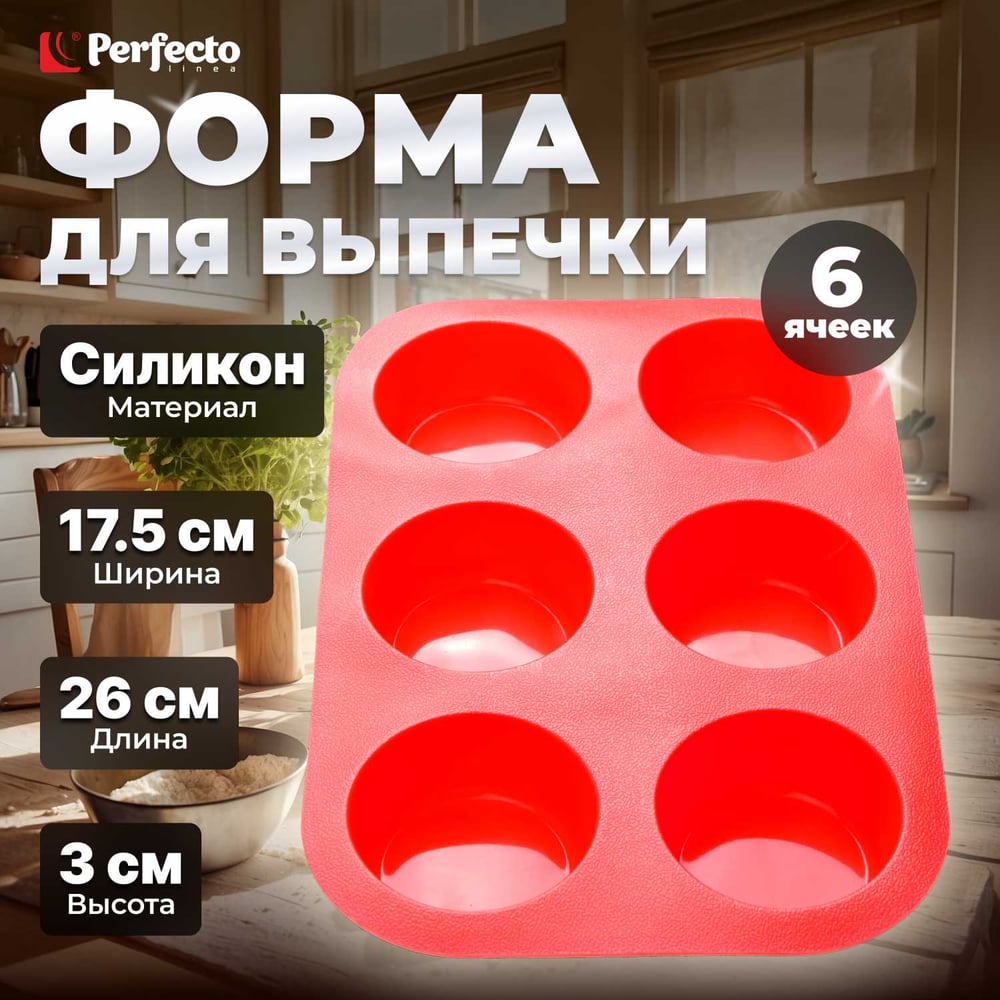 Форма для выпечки PERFECTO LINEA силиконовая, прямоугольная, на 6 кексов, 26x17.5x3 см, красная 20-000415