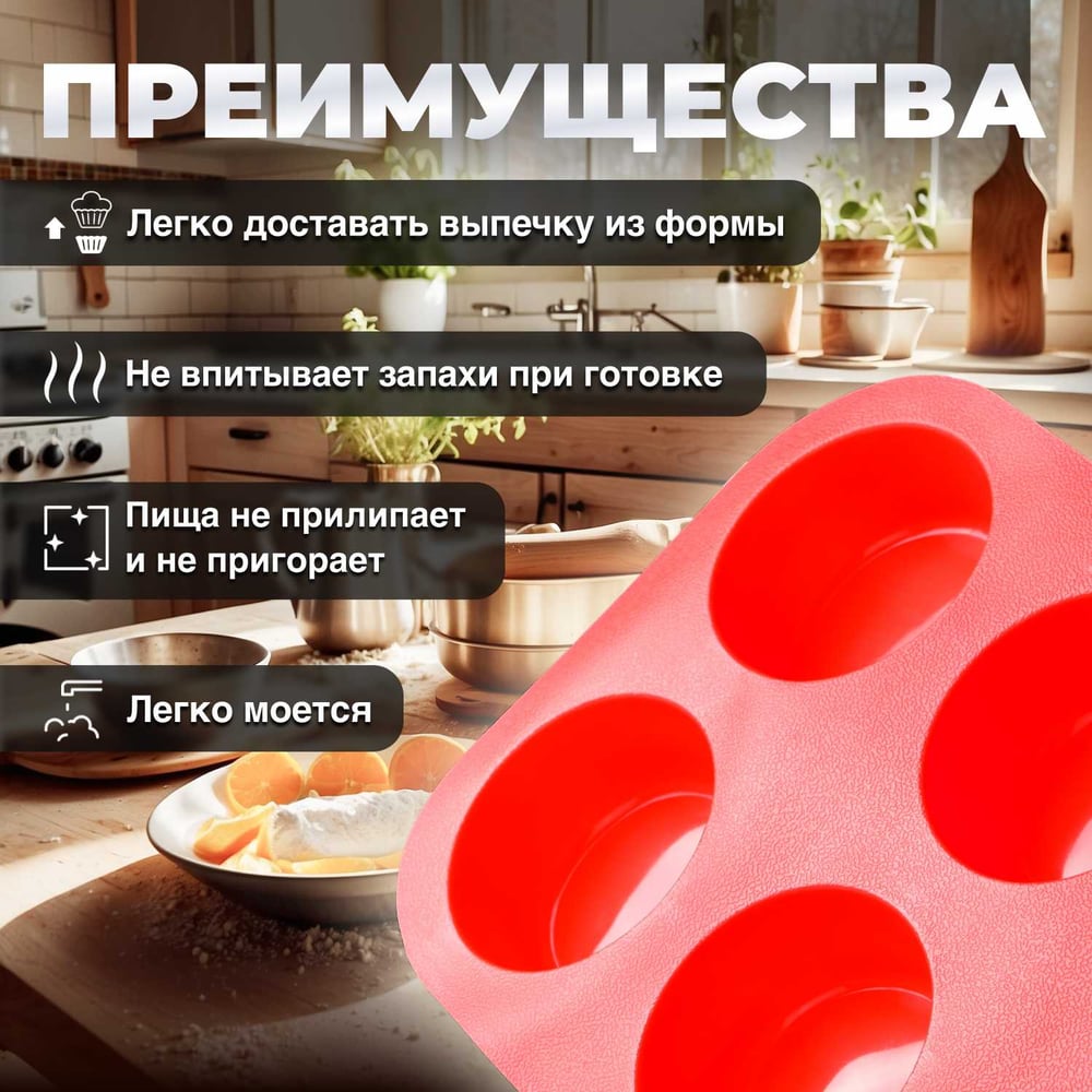 Габариты без упаковки 260х175х30 мм Длина 260 мм Материал силикон Ширина 175 мм Цвет красный Форма круглая Количество в комплекте 1 шт Назначение для кексов Набор нет Глубина 30 мм Ручки для переноса нет Разъемная нет