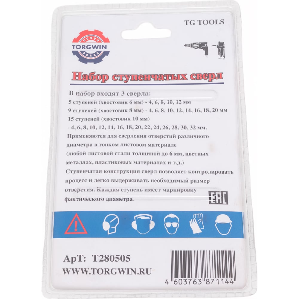 Набор сверл ступенчатых 3 шт, 4x12 мм, 4x20 мм, 4x32 мм TORGWIN T280505